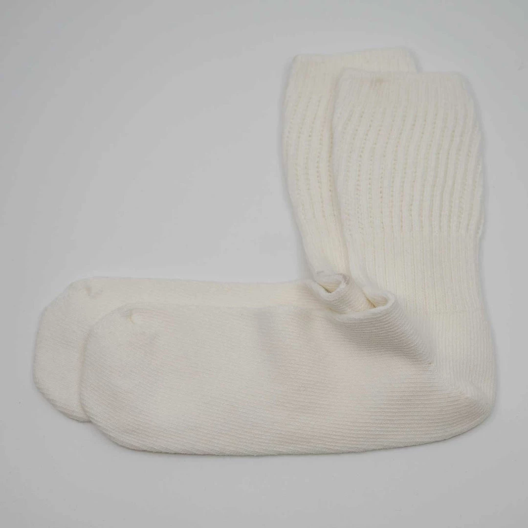 Organic cotton socks made in USA. Discontinued style, available while supplies last. For wearing loose or up. Great for non-constricting circulation. Natural, Navy, Black.