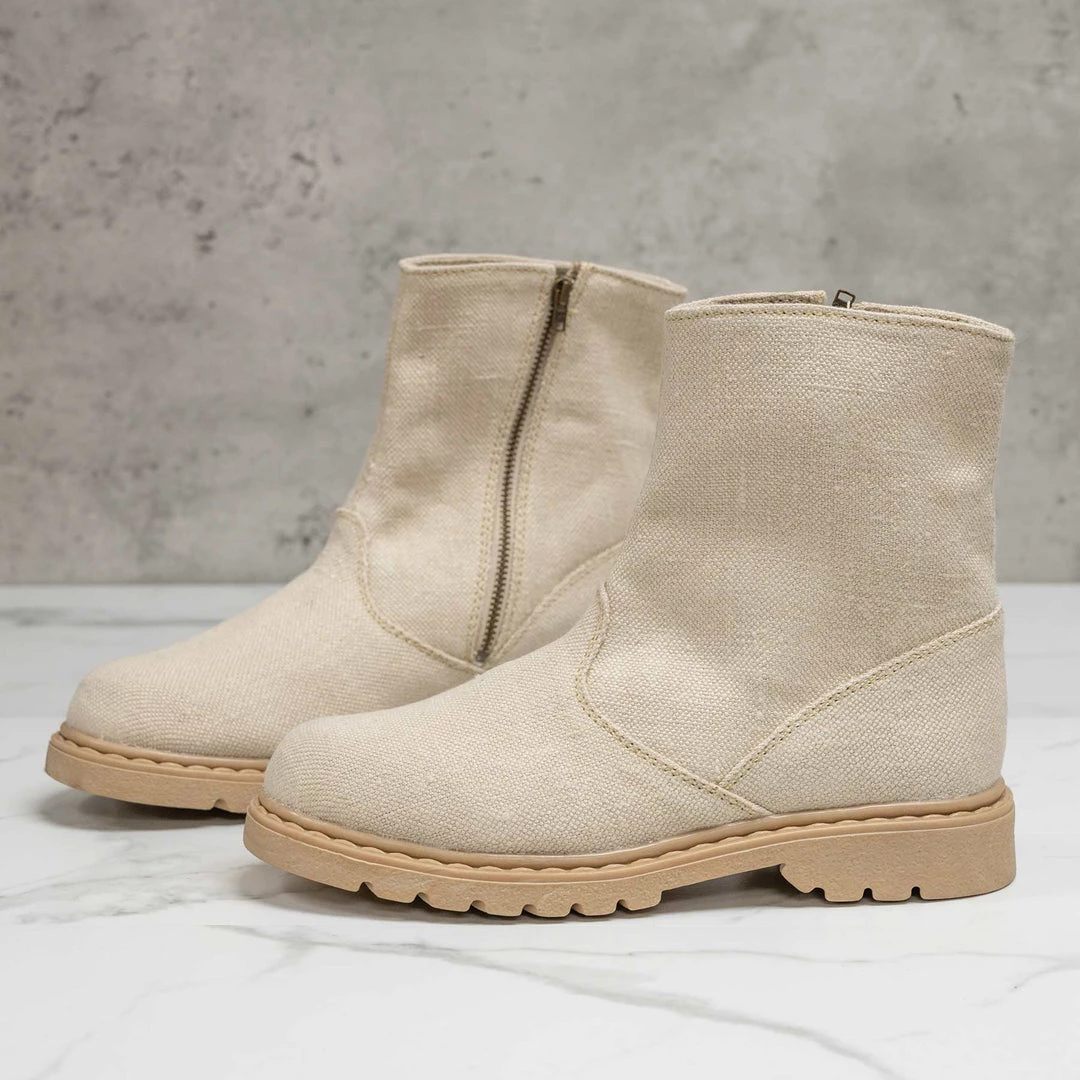 Handmade organic hemp boots with zipper, in ladies’ sizes. Breathable. Waterproof using our 100% natural wax; it takes just minutes to do.