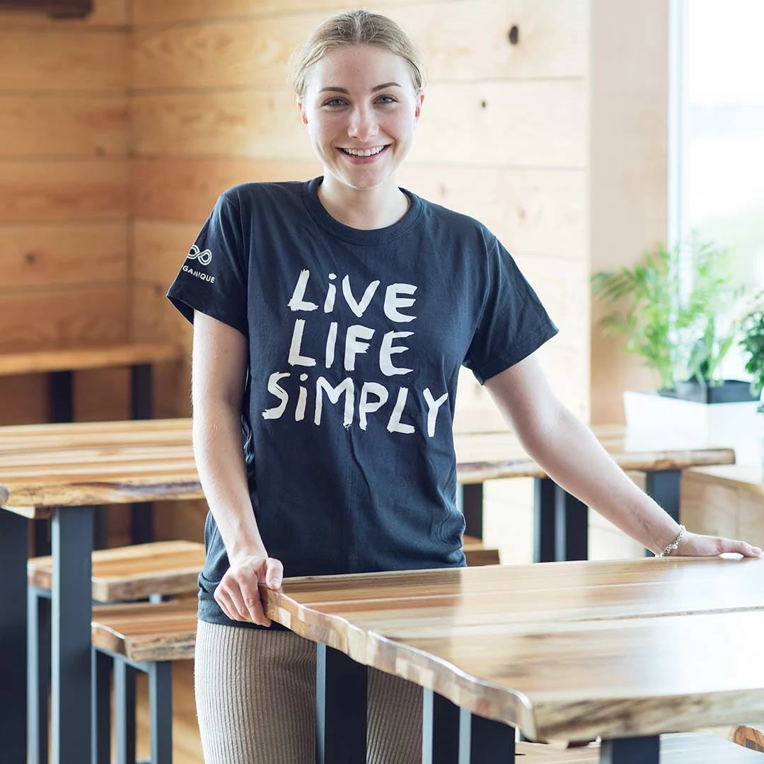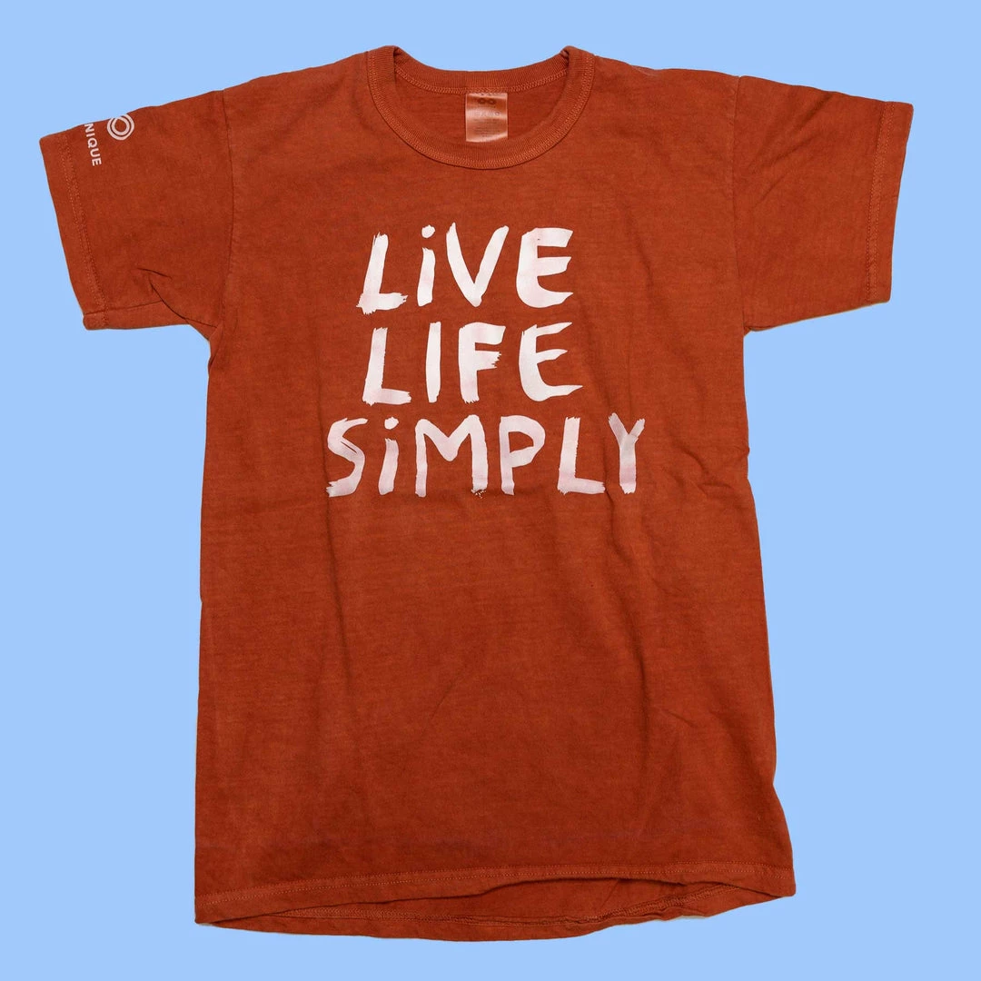 Grown in USA, made in USA 100% organic cotton T-shirt, printed using non-toxic water-based eco ink with “Live Life Simply”. See sizing chart in Image Gallery. S and M run small.Â