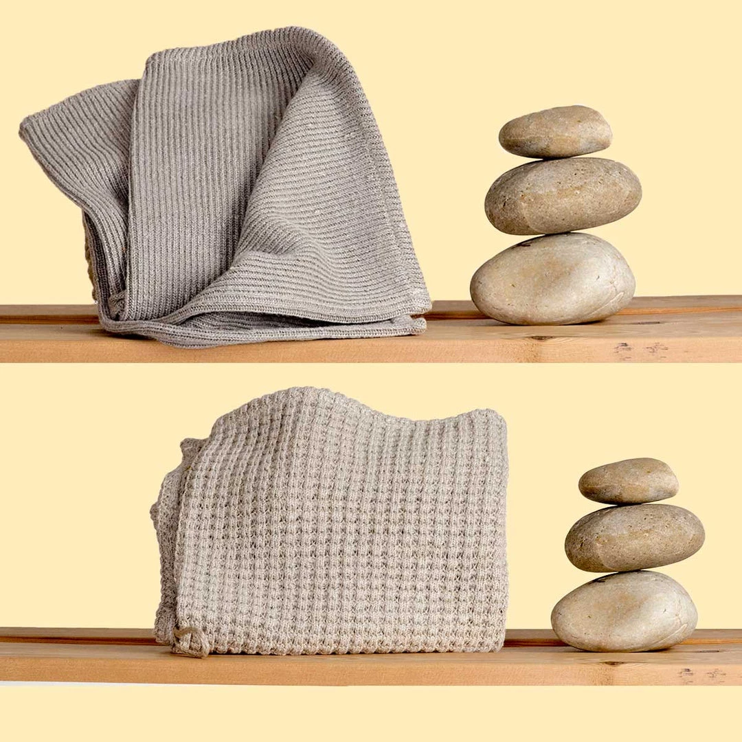 This beautiful 100% organic linen towel is great for the kitchen as well as the bath, or the gym or travels… It’s made from your choice of two heritage knits: ribbed (top) or honeycomb waffle (bottom). Unbleached, undyed, and chemical-free. No GMO, no dioxin, no formaldehyde, no bleach, and no dye. Perfect for chemically sensitive customers and anyone who prefers to live without chemicals in their daily lives. Designed specially for connoisseurs of heritage flax linen from the Old World. Our organic linen knit towels are extremely absorbent and quick-drying. The gentle scrubbing action also helps to revitalize the skin. Also great for drying dishes and counter tops.