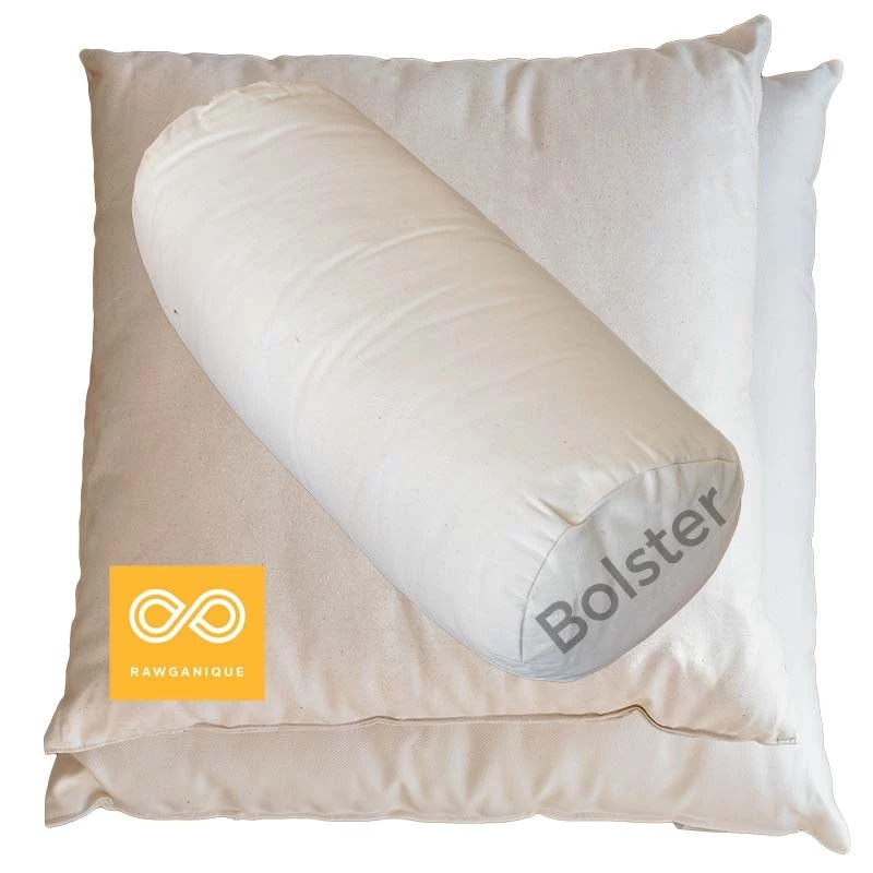 Vegan 100% organic cotton sofa pillow, handmade in USA. Organic cotton twill ticking. Grown in USA since 1997. Hypoallergenic. Chemical-free. Sizes: Travel, Sofa, Bolster (tootsie roll).