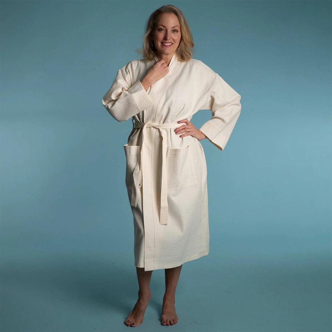 Gets softer with each wash. 100% certified organic cotton honeycomb waffle bathrobe. Sweatshop-free. Chemical-free. Unbleached & undyed.