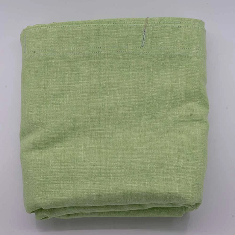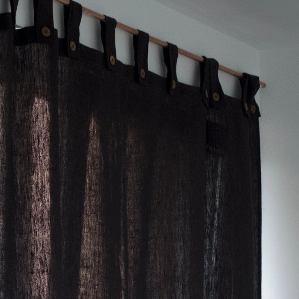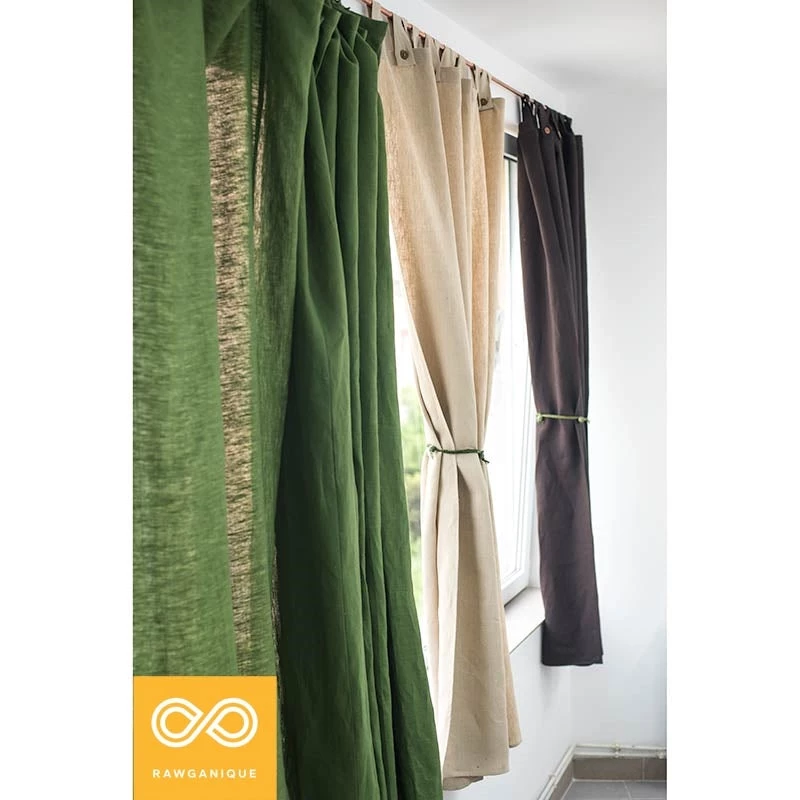 Eco friendly organic hemp curtain with tabbed button closure.