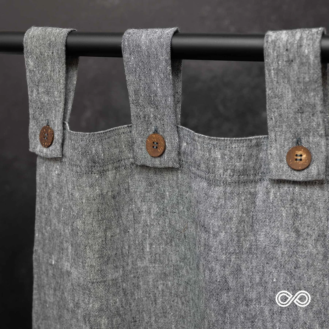 Tabbed hemp curtains. 73.5×72″. From 100% organically grown European hemp. Featuring natural coconut buttons. Made in-house in Europe for true purity. Chemical-free. Black Platinum Chambray. Our curtains are cut longer than stated to allow for shrinkage (up to 5% in the length).