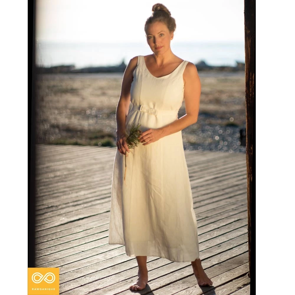 The Audrey Hemp Dress and Evening Gown is made from organically grown European hemp. Lined with wild raw ahimsa silk. Heritage styling.