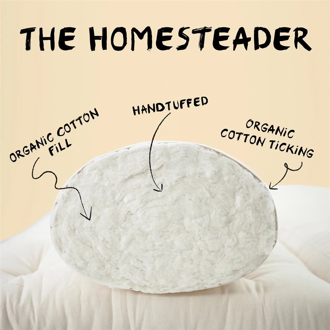 Organic Cotton Futon-Stye Mattress. Twin, Twin XL, Full, Queen, Eastern King, and California King sizes. Made in USA. 100% Organic cotton (5″ and thicker requires a doctor’s prescription, to meet fire retardancy regulations; 1.5″ and 3″ thick doesn’t require that). The sewing uses only 100% cotton thread. The tufts require cotton-covered nylon thread for strength.
