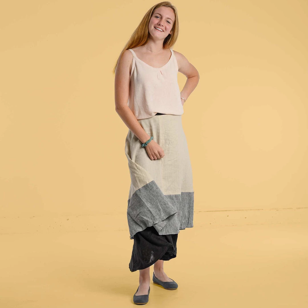 The Habanera Hemp Skirt is flattering in all the right places and elegantly drapes and flows.The two-layer styling allows folds to drape with simple elegance. The organic hemp knit and organic hemp woven fabric breathe exceedingly well, for full all-day wearing comfort.
