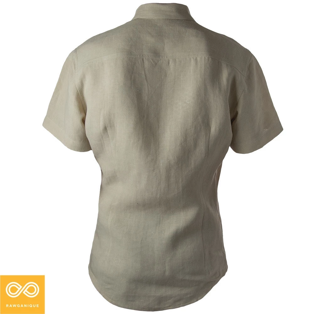European slim fit 100% short-sleeve cannabis hemp dress shirt. Natural color. Left breast pocket. Made at the Rawganique Atelier in Europe.