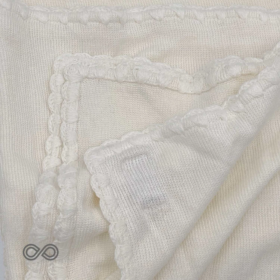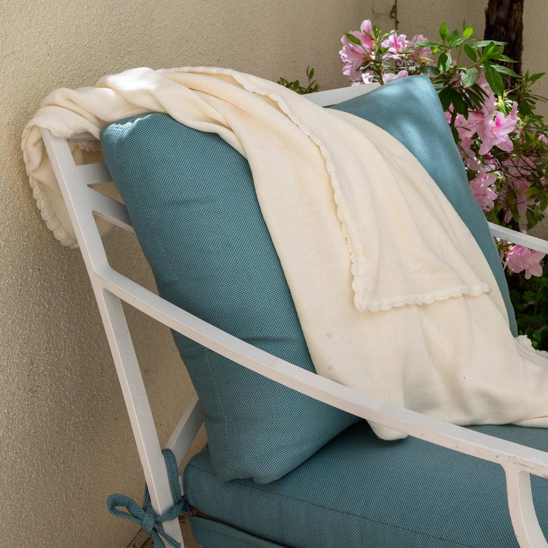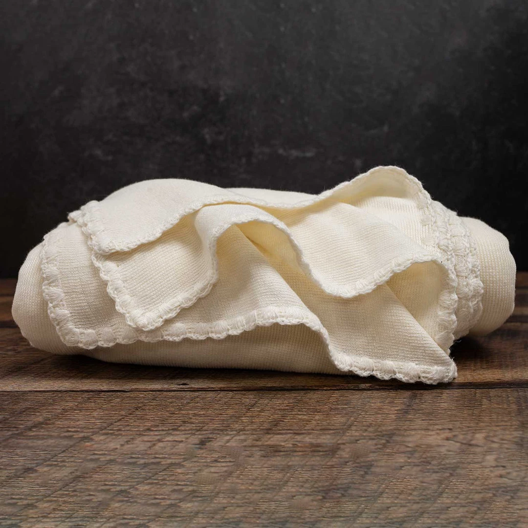 Heritage. Beautifully breathable and insulating. Rare & special organic linen ribbed knit with scalloped edges. Ivory. Throw, Twin, Full, Queen, King.