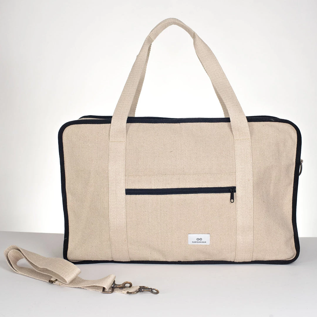Looking for vegan organic hemp carry-on luggage? Max out on the carry-on allowance with our 100% organic hemp carry-long luggage that can be carried on the shoulder with the handle or strap. This hemp luggage fits a TON of stuff because there is no wasted space for wheels & handles. There is a handy zippered front pocket to keep your passport, itinerary, wallet, watch, etc handy while going through the check-in counter & security checks. Go for a weekend or a week or a month anywhere your heart desires with our leather-free, zero-waste, plastic-free organic hemp carry-on luggage in tow. Bon voyage!