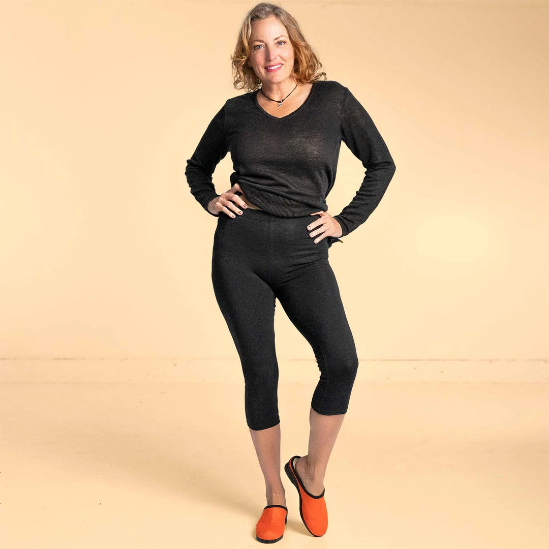 Organic cotton cropped stretch leggings. Made in a women’s co-op in Peru, sweatshop-free. Covered elastic waistband. Please note the color swatch photo in the Image Gallery for the different colors.