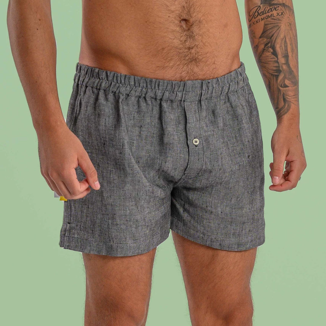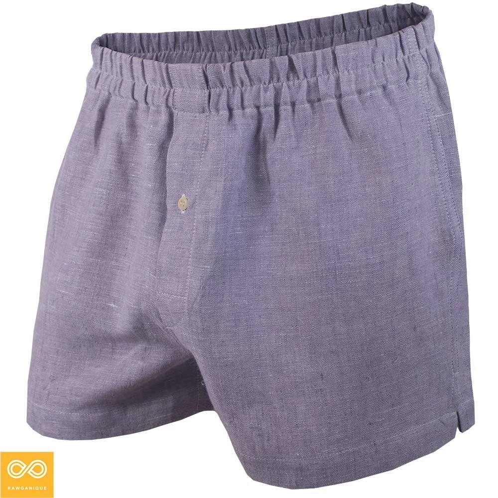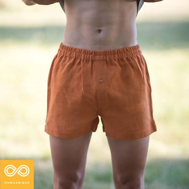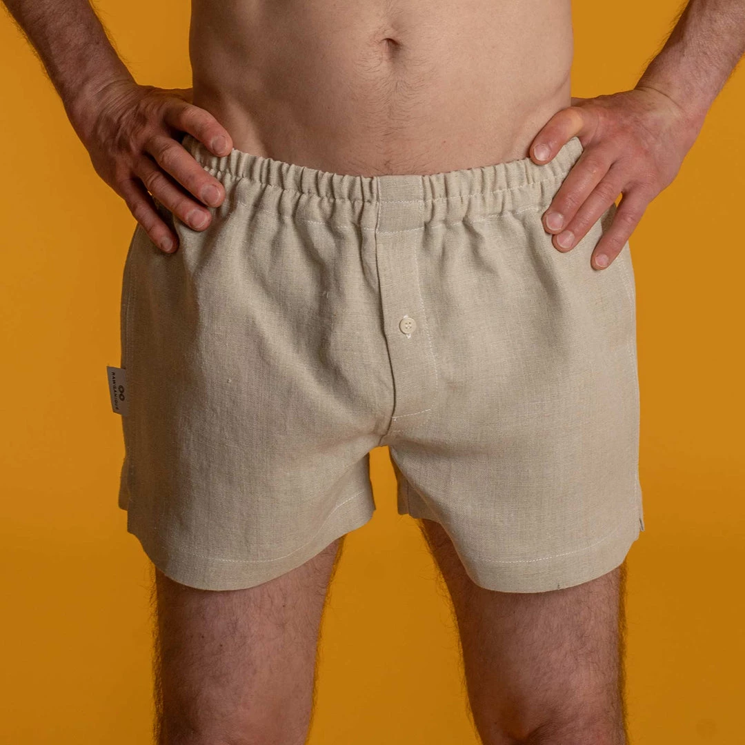 Style: Classic hemp woven boxer shorts with buttoned fly access