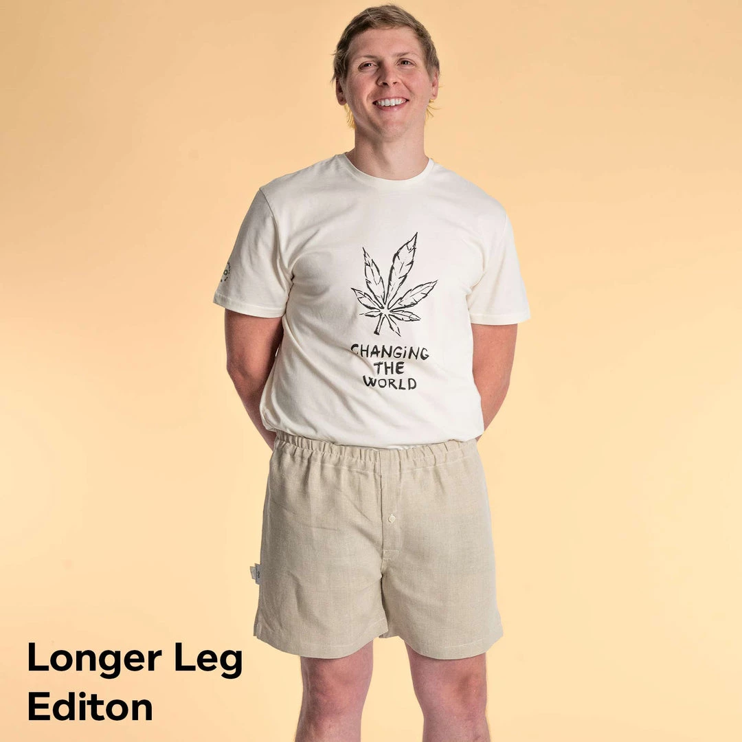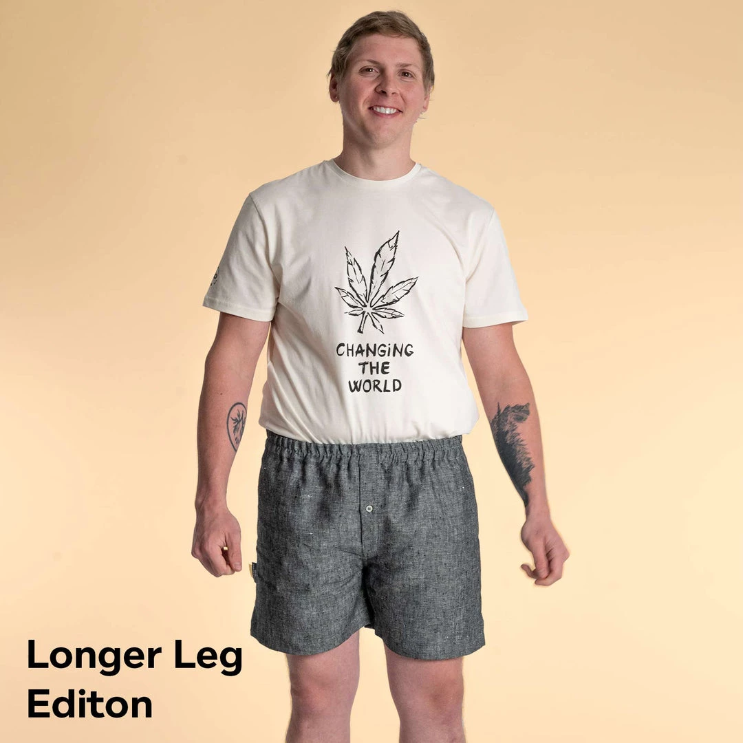 NEW: By popular demand, we are now making a special limited edition longer leg Joey organic hemp boxers in Black Platinum and Natural. Inseam is longer by 2”.