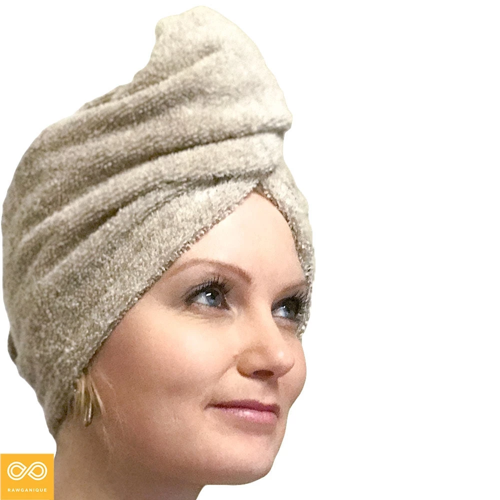 Organic Linen Terry Hair Wrap Turban. One size fits all. Made by Rawganique in Europe. Unbleached and undyed.