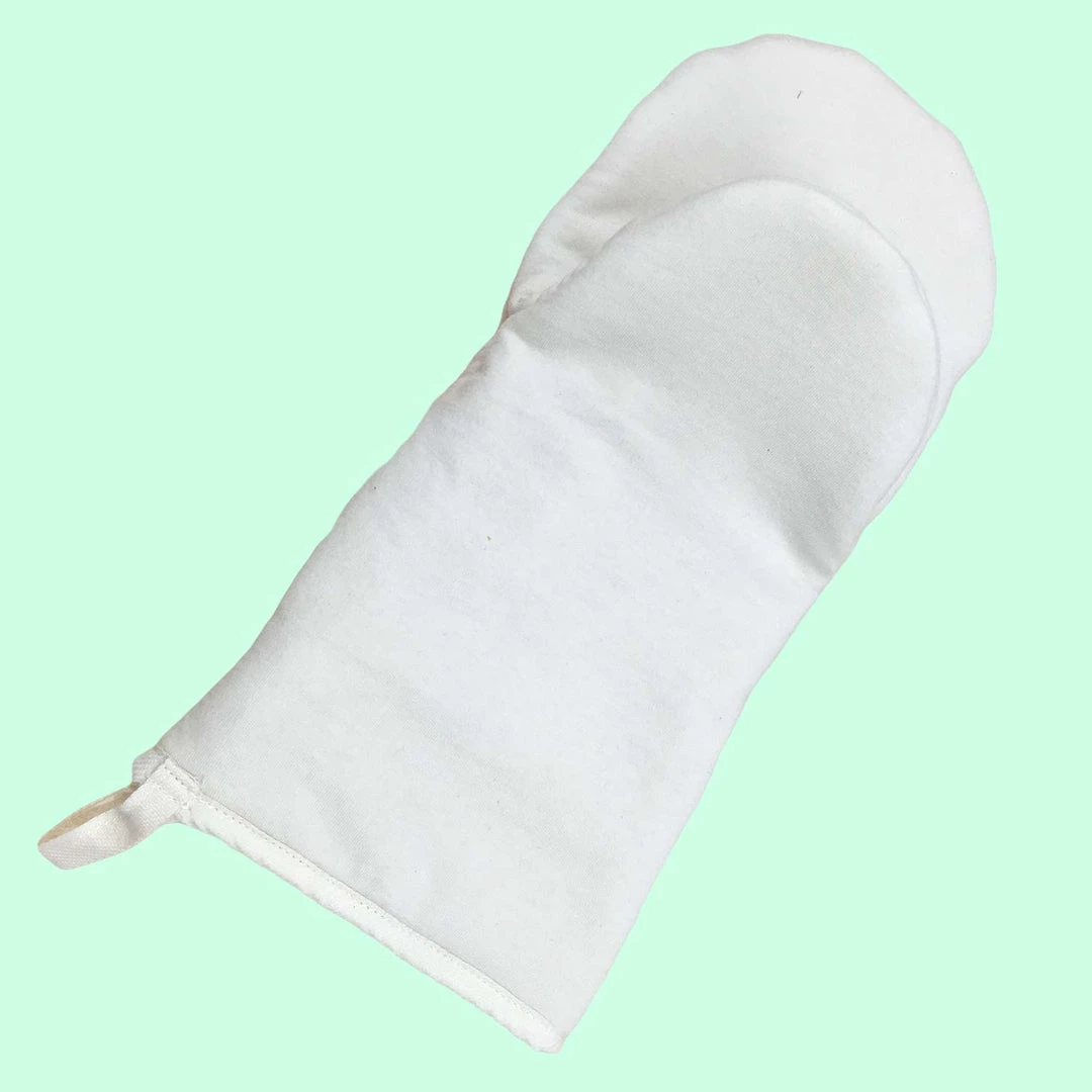 Our cozy organic cotton oven mitts measure approximately 6 by 10 inches. Unbleached & undyed. Raw cuisine aficionados will find many uses for it as well – Durian opening being just one we’ve often seen. Vegan organic cotton kitchen accessories at their animal-friendly purest best!