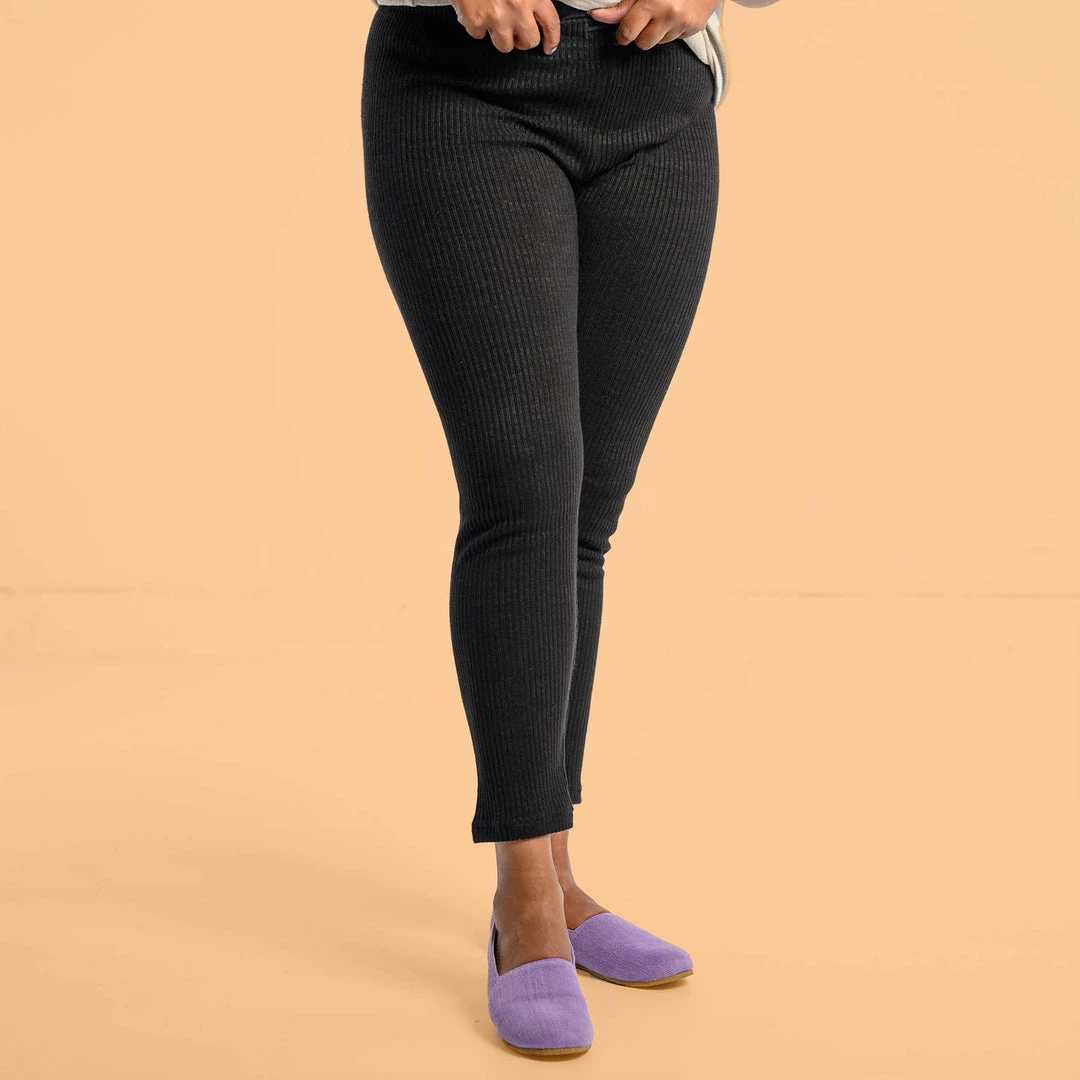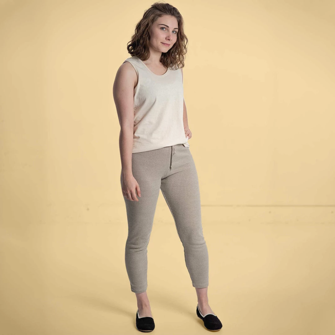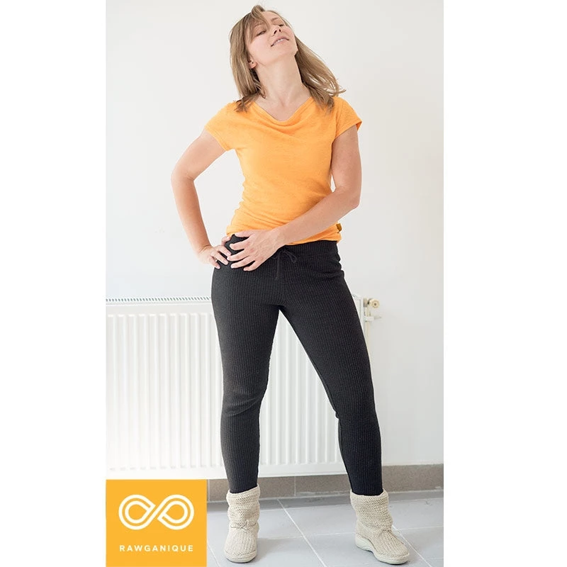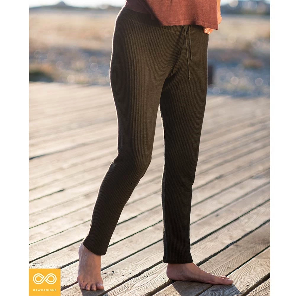 One of our most popular items since 1997. 100% organically grown hemp yoga leggings. Cozy and hugging because of the special hemp ribbed knit but not confining like polyester-y elastic leggings. Covered elastic waistband with drawstrings.