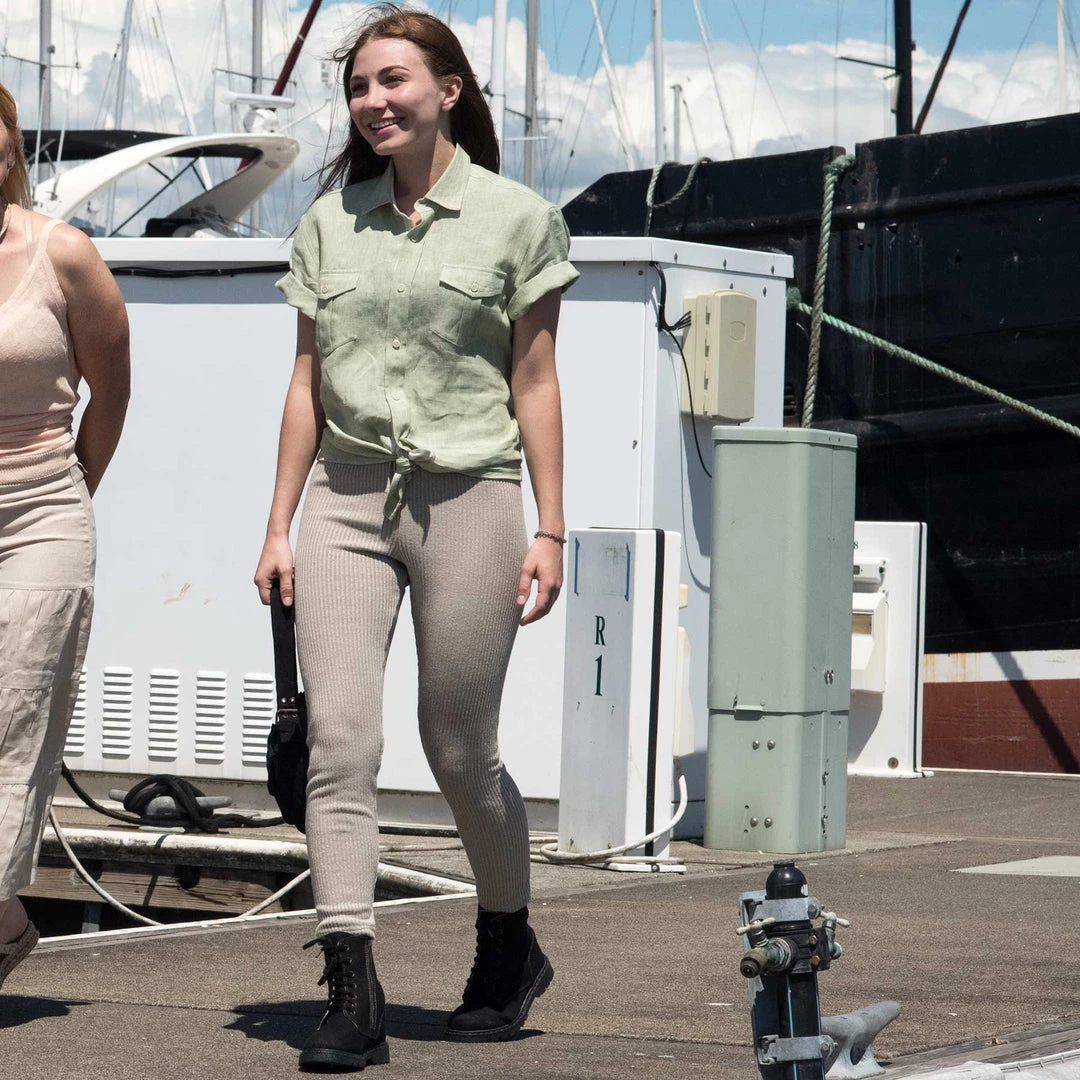 Our ethically made, cruelty-free, and sustainable organic hemp yoga leggings are made from a super-special 100% hemp ribbed knit that is stretchy, breathable, lycra-free, and latex-free. There is zero elastic and zero synthetic finer in the 100% organic hemp ribbed knit. The non-toxic organic hemp yoga leggings feature a covered elastic waistband and drawstrings. The elastic waistband is completely covered in the hemp knit fabric; elastic can easily be removed from the waistband, if desired.
