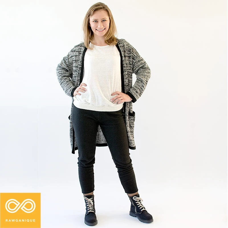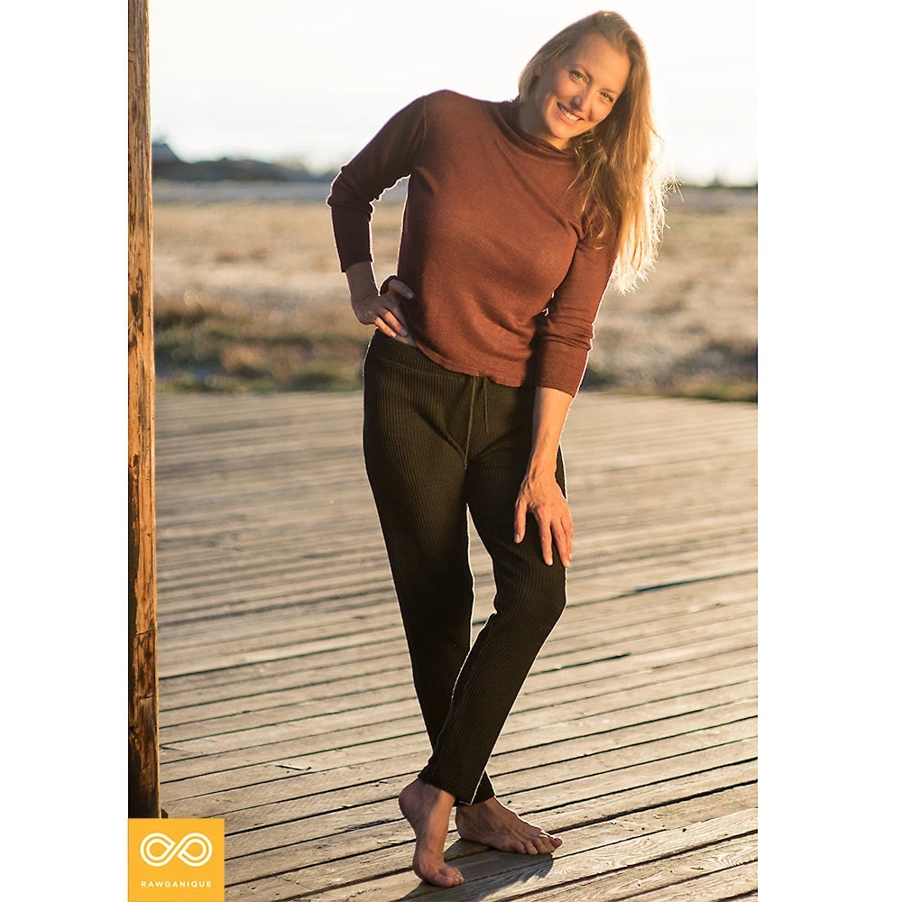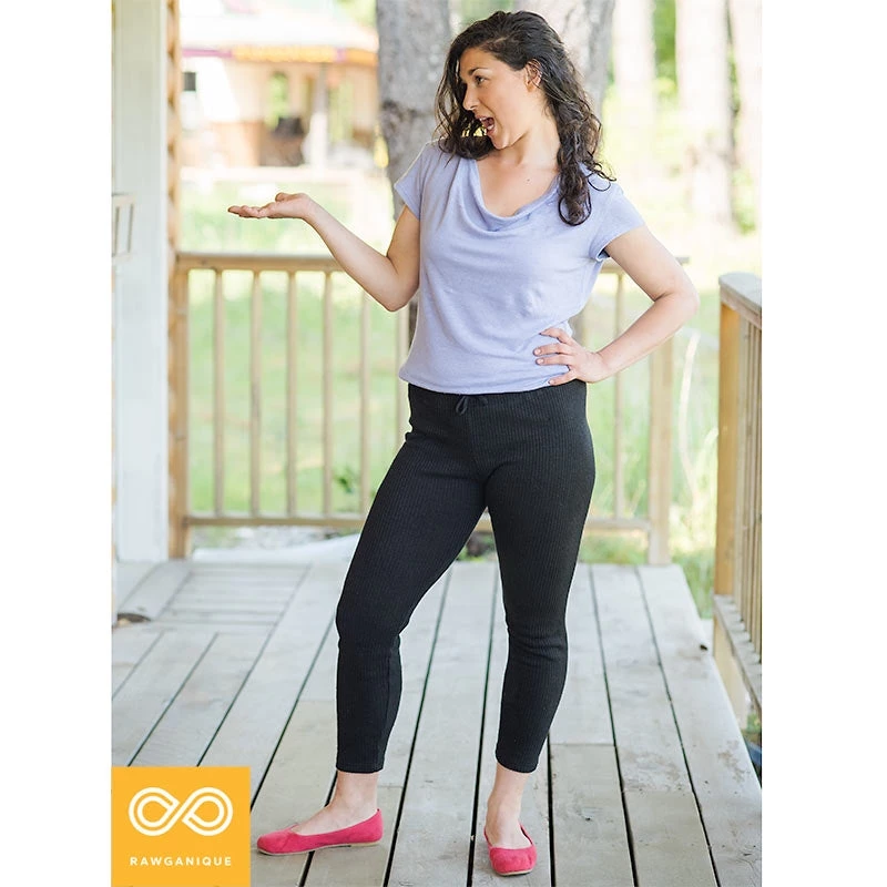 Our all natural organic hemp yoga leggings are made in-house at the Rawganique Atelier from start to finish for true purity: we grow, knit, and sew each pair of hemp pants and many other organic cotton, linen, and hemp yoga clothing and apparel for men and women.