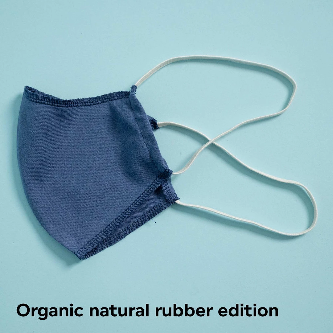 Super soft and pure 100% organic cotton face covering with elastic earlobes. 1-layer no-frills organic cotton mask. Choice of regular elastic or organic natural rubber (50% organic cotton woven with 50% natural rubber to create an all-natural organic elastic band). The organic natural rubber edition has longer loops by design: simply knot the loop to desired size. Good to use as liner mask underneath another mask (like if you have to wear an N95, for example, but don’t want to be exposed to the formaldehyde and dioxin in chemical masks). Easy-on, easy-off elastic ear loops.