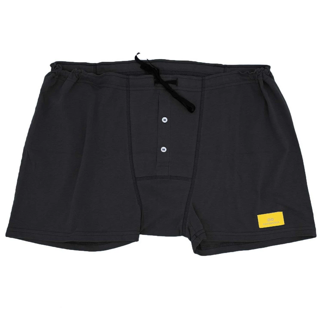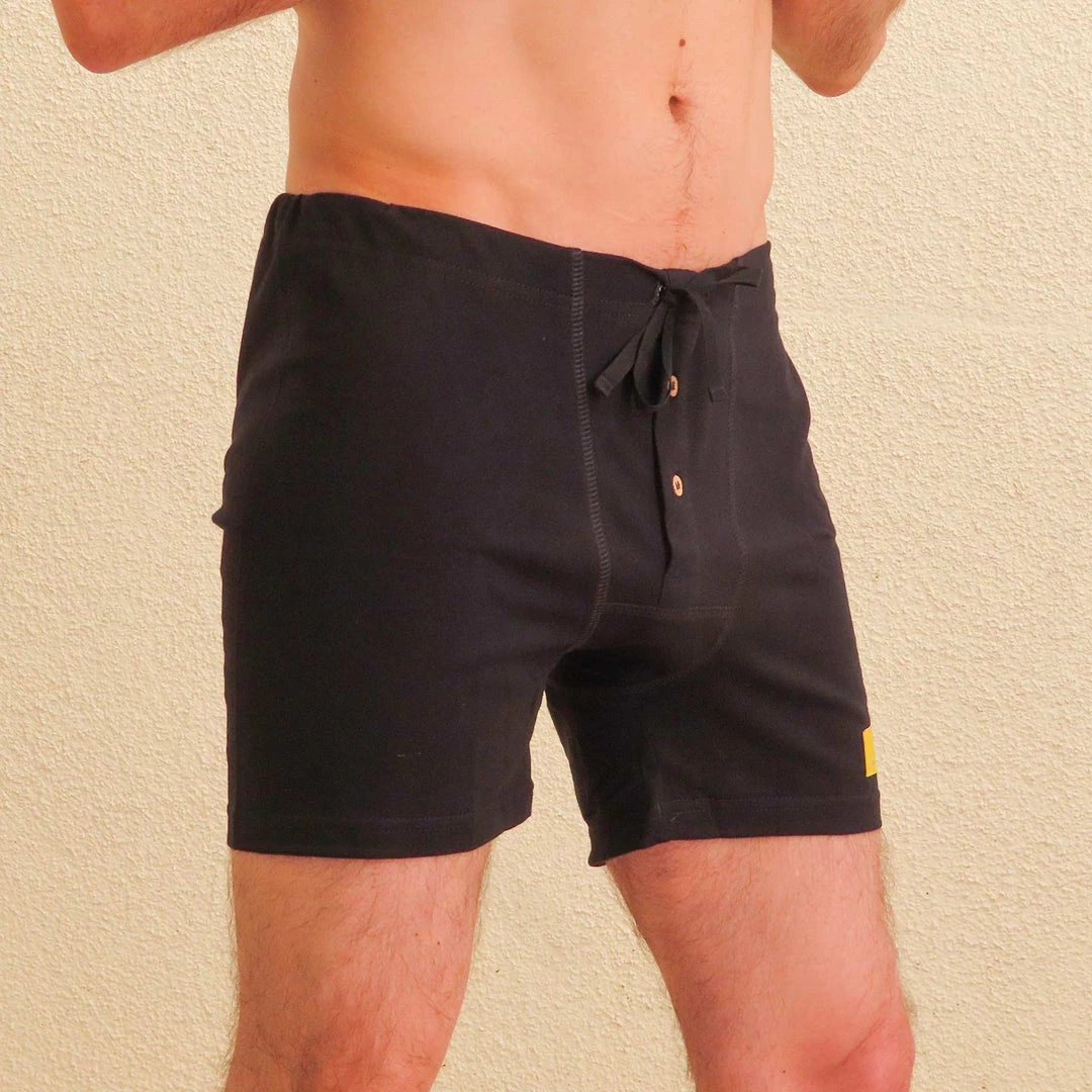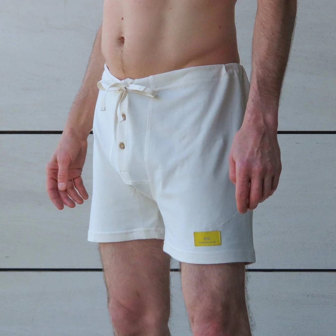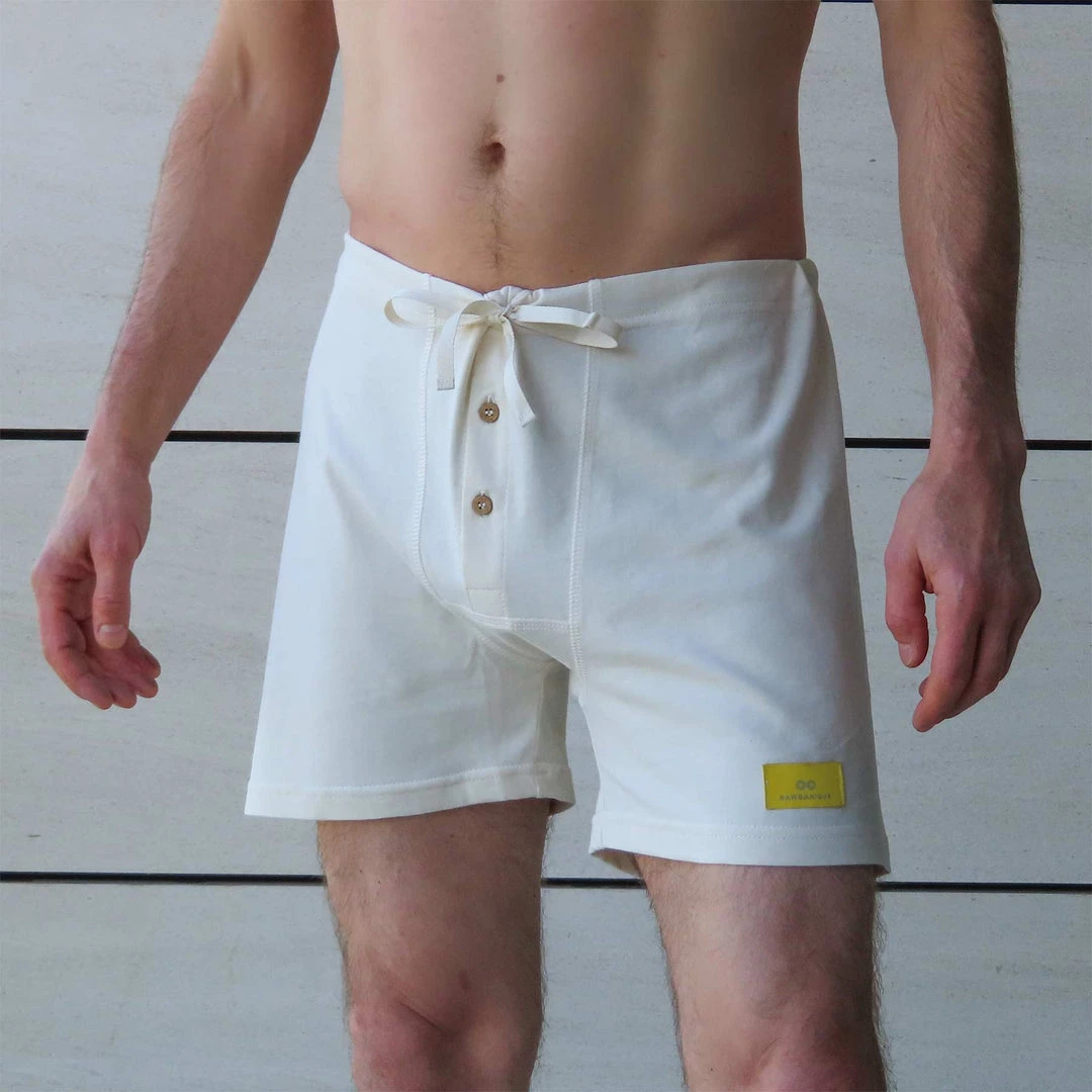 Style: Elastic-free organic cotton knit drawstring boxers with buttoned fly