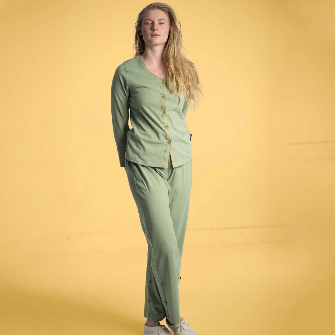 Eco-friendly, ethically & sustainably made organic pajamas for the sweetest night ever. Our chemical-free, elastic-free 100% organic cotton pajamas are super soft, smooth, silky & cozy. The ultimate in purity down to the details: Organic cotton threads; Natural coconut or tagua nut buttons (a cash crop for the indigenous people that helps save the Amazon Rainforest), both are vegan and plastic-free. An absolute essential for the chemical-free, natural lifestyle.
