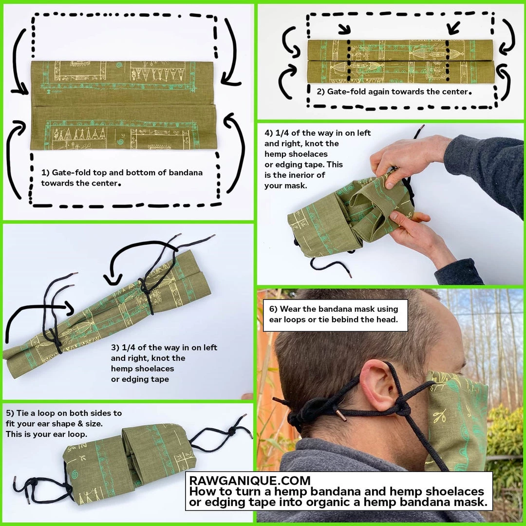 100% organic hemp bandana in many eco colors. Can be used as a face covering. Breathable, chemical-free, safe. Submerge in boiling water for 30 seconds to clean disinfect and sanitize. Air dry. Or hand-wash or machine wash on gentle/handwash cycle. No dryer is best. Steam iron at linen settings.