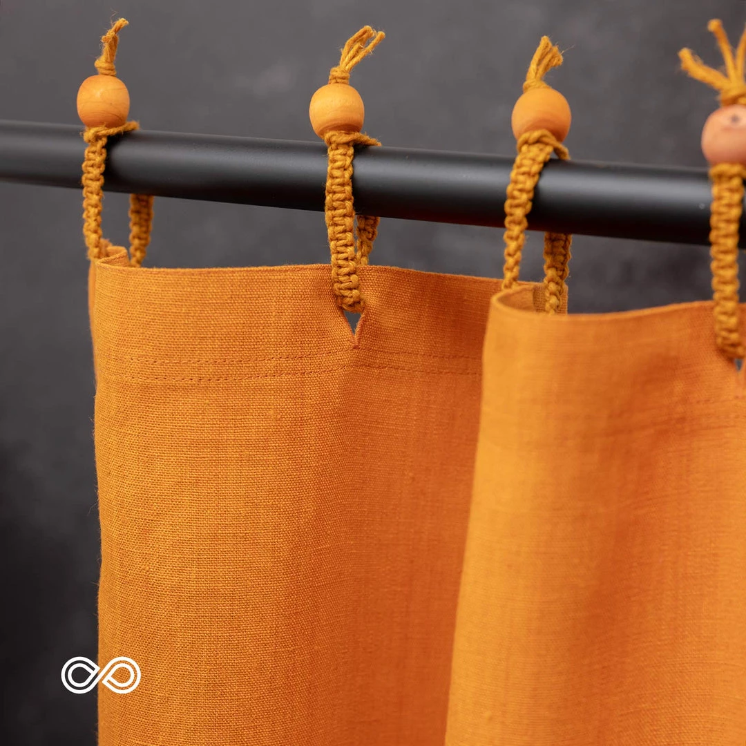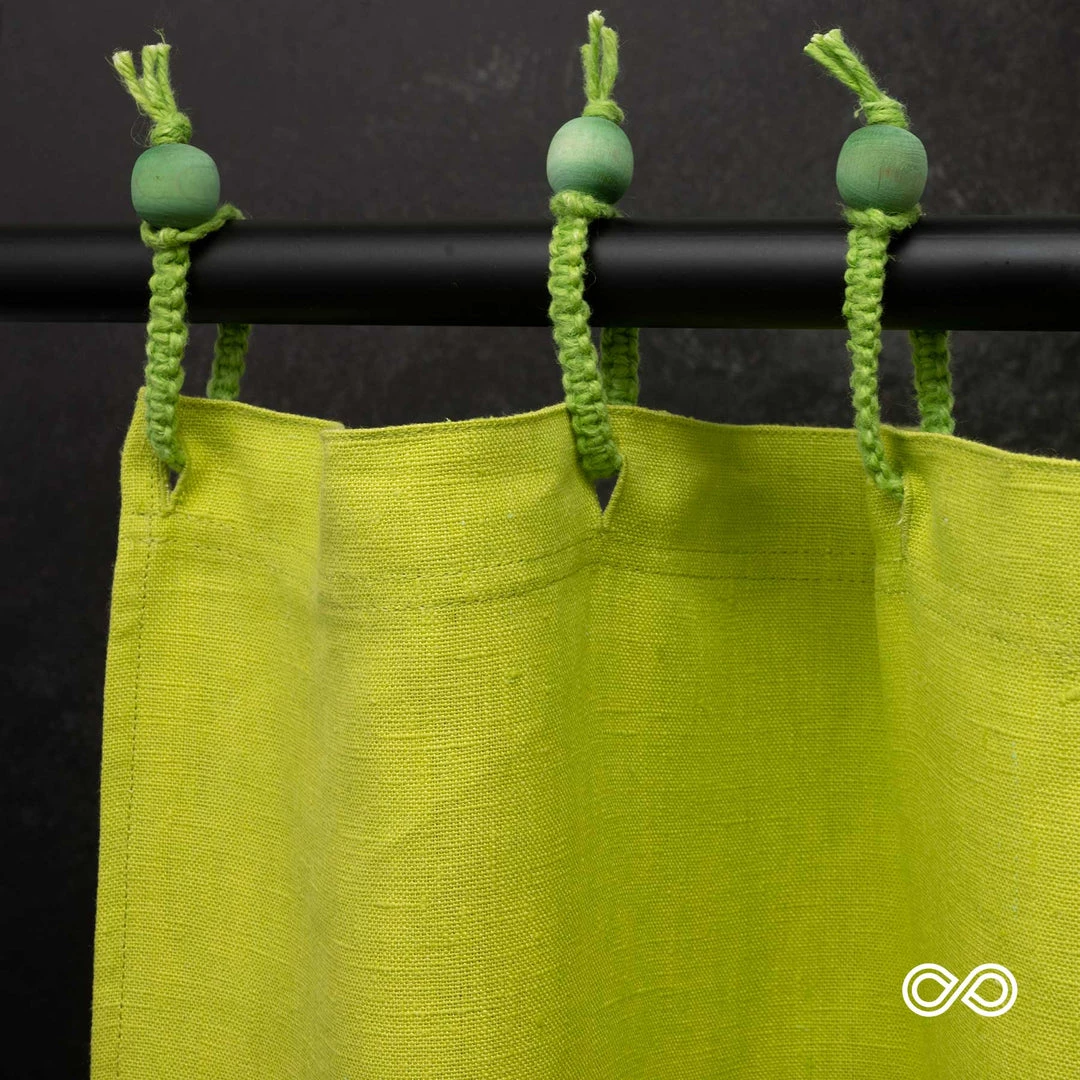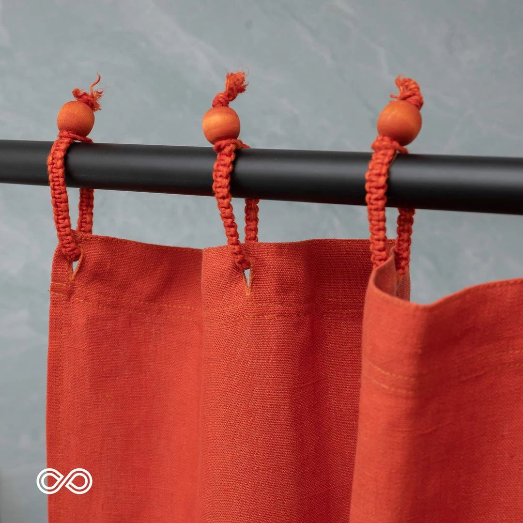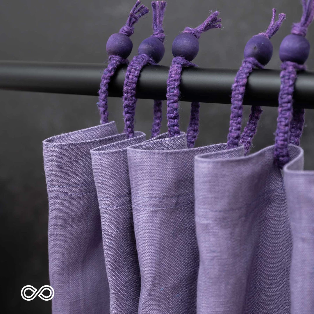 Our organic hemp curtain features beautiful handmade 100% hemp macrame rings with wooden button closure – a rustic elegant detail that adds greatly to the natural beauty of the organic hemp window treatments and wall coverings.