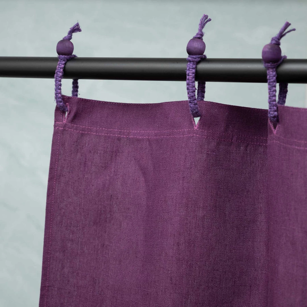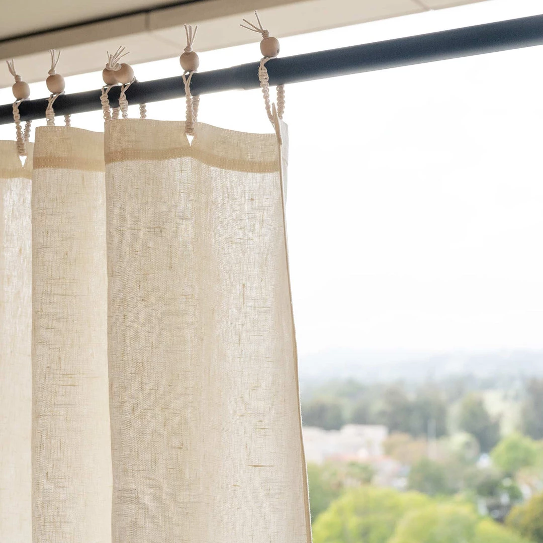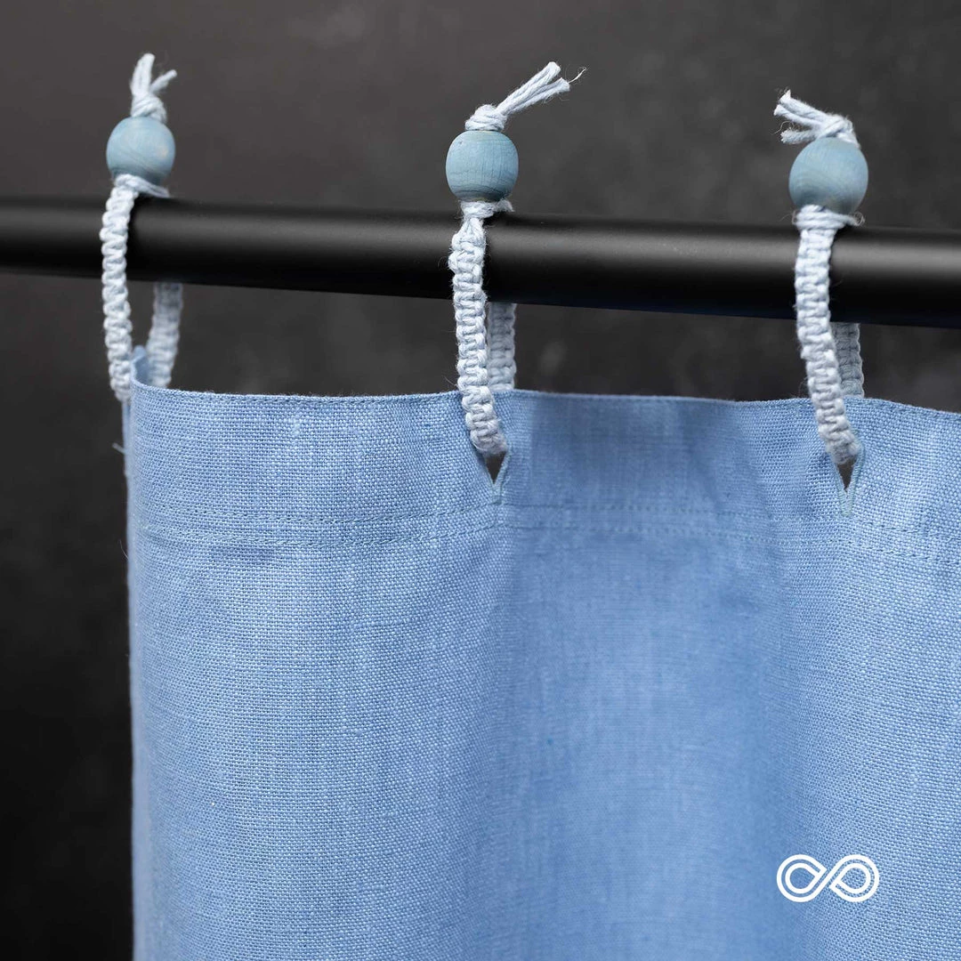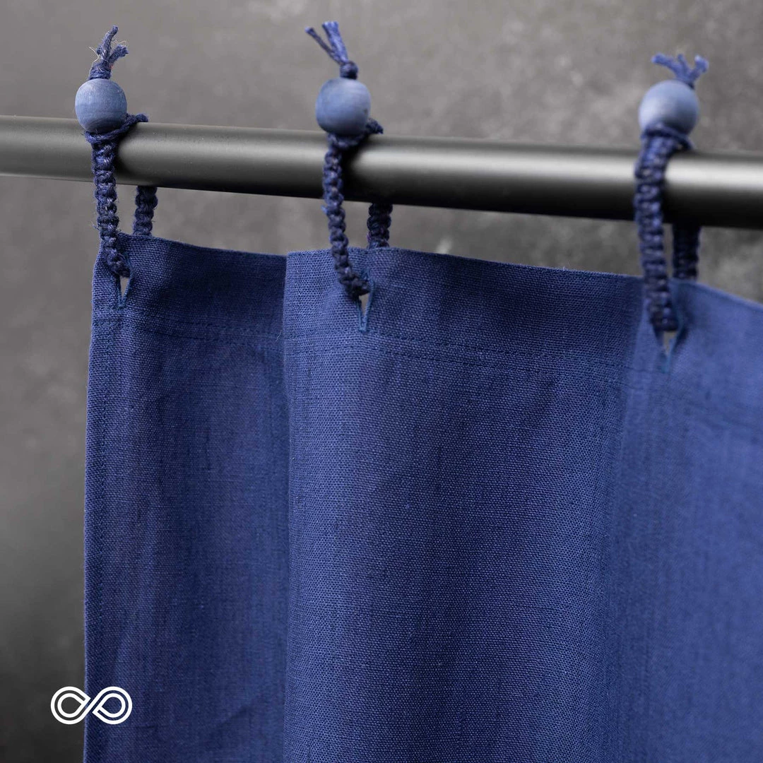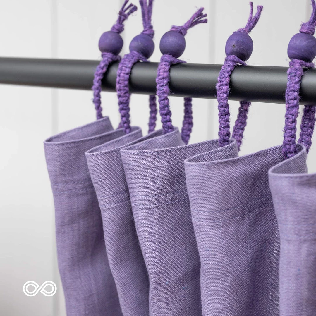 Our organic hemp curtain features beautiful handmade 100% hemp macrame rings with wooden button closure – a rustic elegant detail that adds greatly to the natural beauty of the organic hemp window treatments and wall coverings.