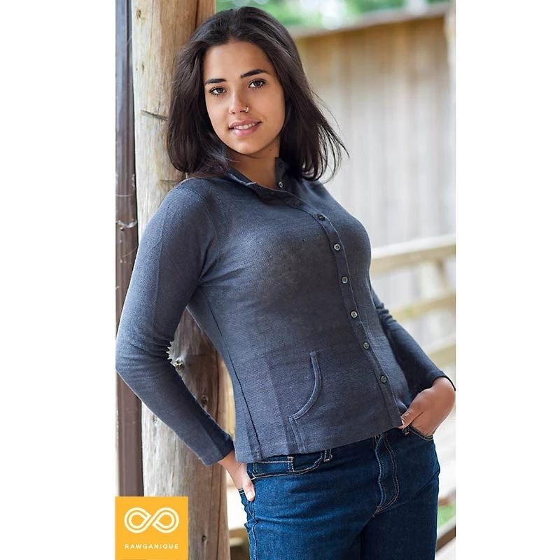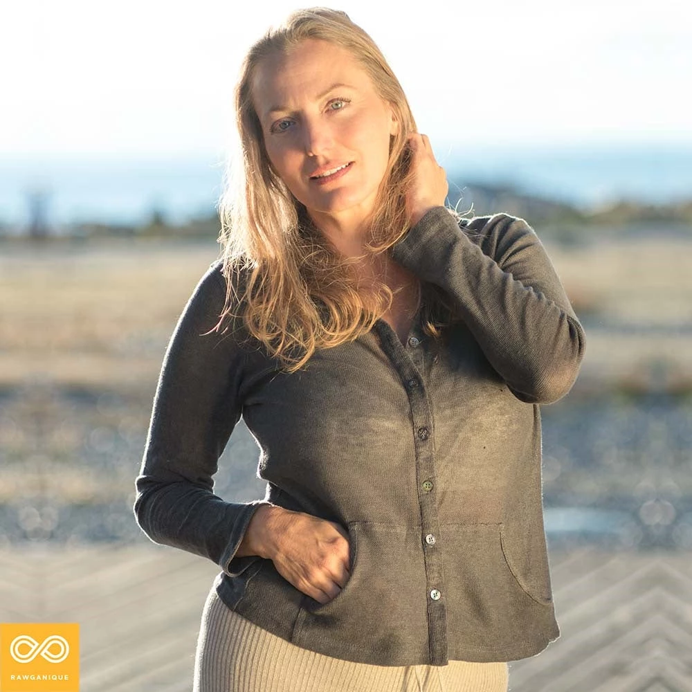 Button-down organic hemp cardigan with a cozy hoodie. Casual yet refined, thanks to the rarefied and gorgeous hemp jersey fabric. Two scooped front pockets. Natural wood buttons.
