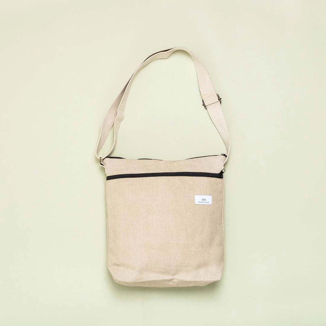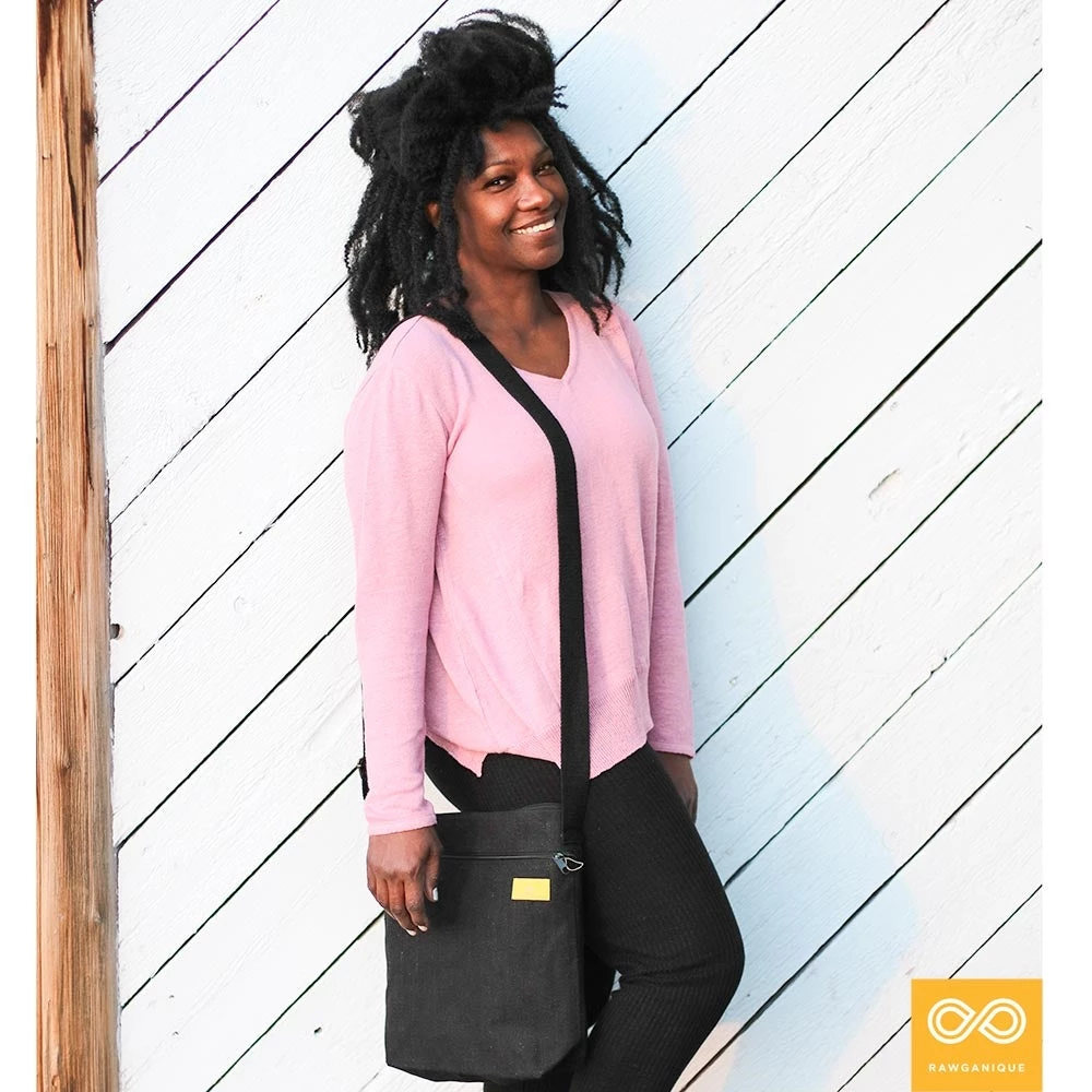 - Infinitely adjustable hemp shoulder strap for easy over-the-shoulder carrying