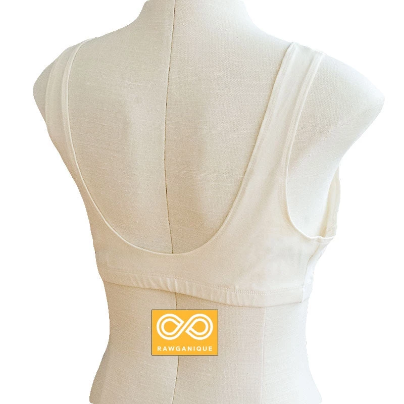 This classic casual organic bra top features un-seamed cups, which is great for a clean look under tees & tops/dresses. It has a scooped back. The design is elegant & uncomplicated. The under cup seaming & 10% lycra content add support & shape. Best for cup sizes A – C.