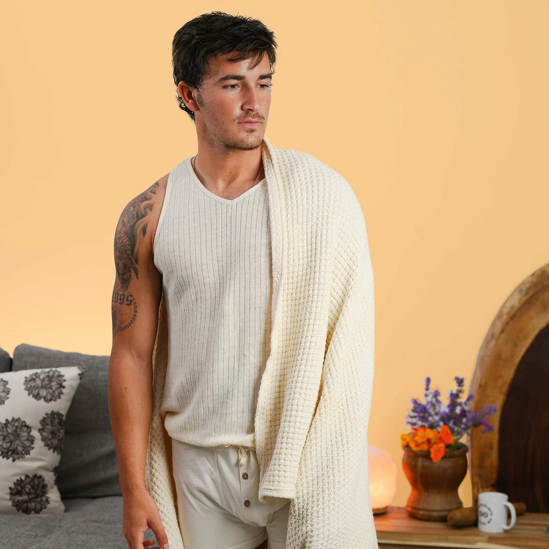 100% organic cotton blanket, made in USA, woven from USA-grown 100% organic cotton. Pure. Untreated. Unbleached. Un-dyed.