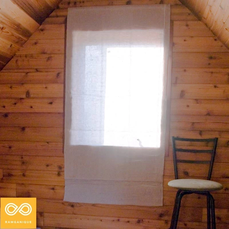 The Pomona Organic Linen Roman Blinds are PVC-free, GMO-free, dioxin-free, formaldehyde-free, and sweatshop-free. We make our exclusive organic linen Roman Blinds at the Rawganique Atelier in Europe for true purity. Natural untreated wood bar enclosed in organic linen fabric.
