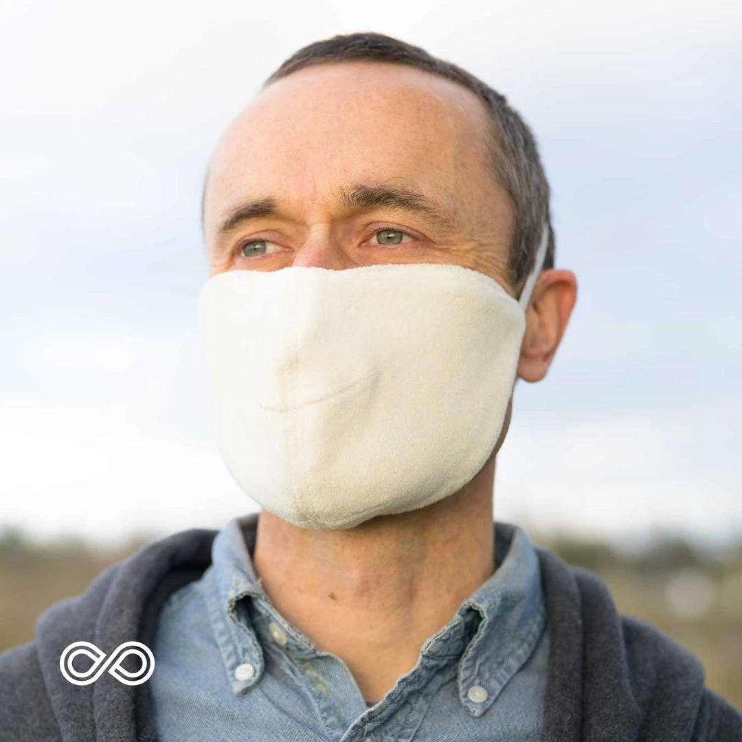 Pure two-layer organic cotton face mouth mask. One side features our cozy 100% organic cotton fleece; the other side is made with our ultra-soft and tightly knitted 100% organic cotton jersey for a dually effective 100% natural barrier against pathogens and particulates. One elastic band design features an elastic that is worn high in the back of the head. Reversible, either side can be worn. But the up-down fits one way only, so if the after putting on the elastic, the fit isn’t good, turn the face mask upside down and try again.Â