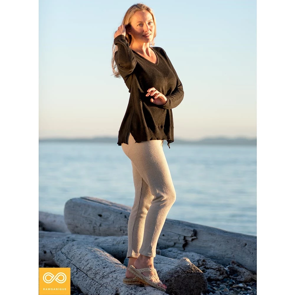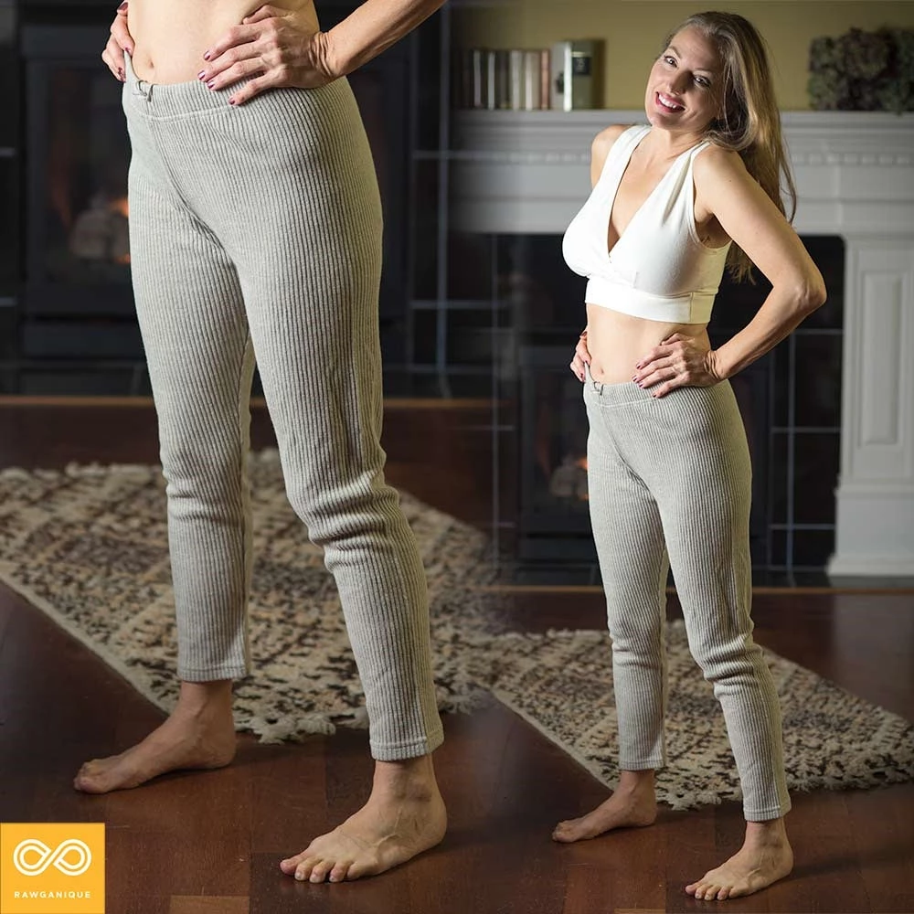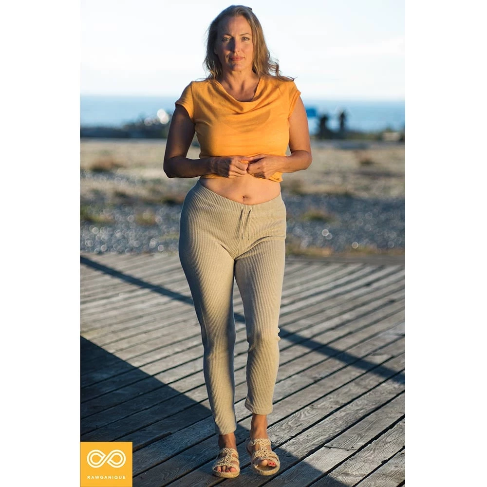 Comfortable, cozy, pure 100% organic linen leggings made by Rawganique since 1997. Our exclusive ribbed linen knit is stretchy and hugging but not confining like polyester leggings. No polyester or elastane in the knit, which is 100% organic linen jersey knit. Covered elastic waistband with drawstrings. Perfect for everyday wearing, yoga, and lounging around the home.