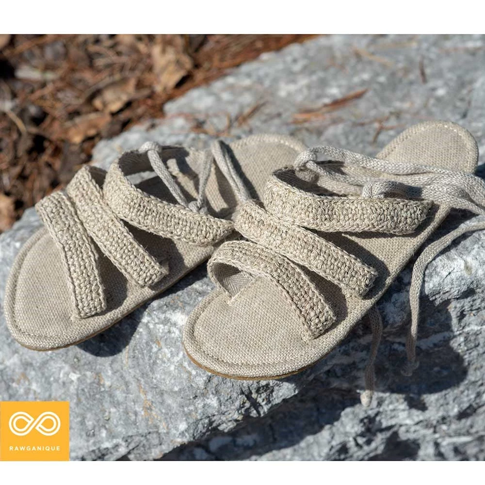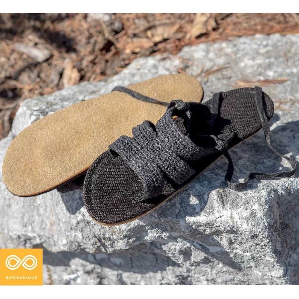 These eco-friendly and breathable organic hemp sandals are grown, woven, knitted, and hand-crafted at the Rawganique Atelier in Europe.