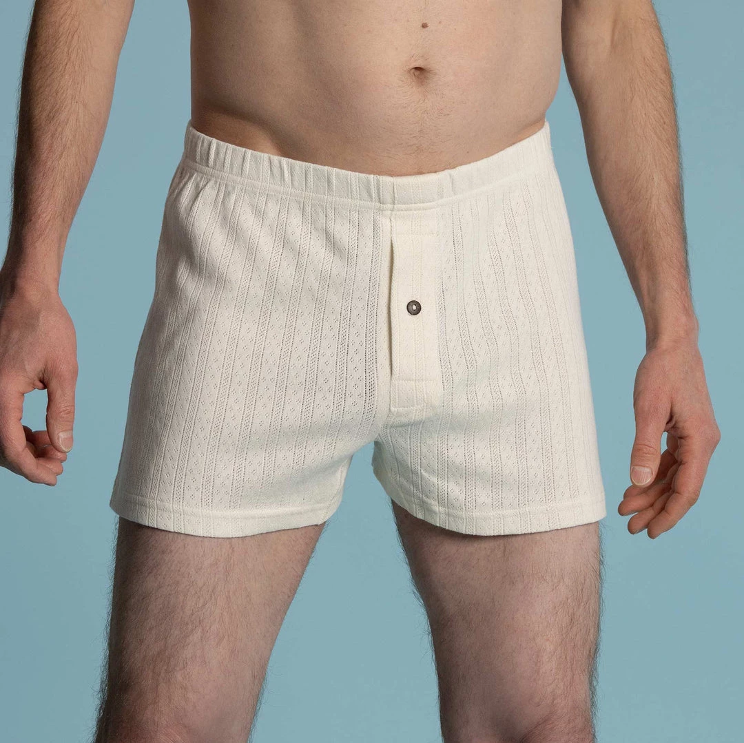 Amazingly soft and breathable 100% organic cotton jacquard mesh jersey boxers. Featuring 100% natural coconut buttons. S – XL. Natural, Grey, Black. Made at Rawganique Atelier from the finest and purest long-staple organic prima cotton.