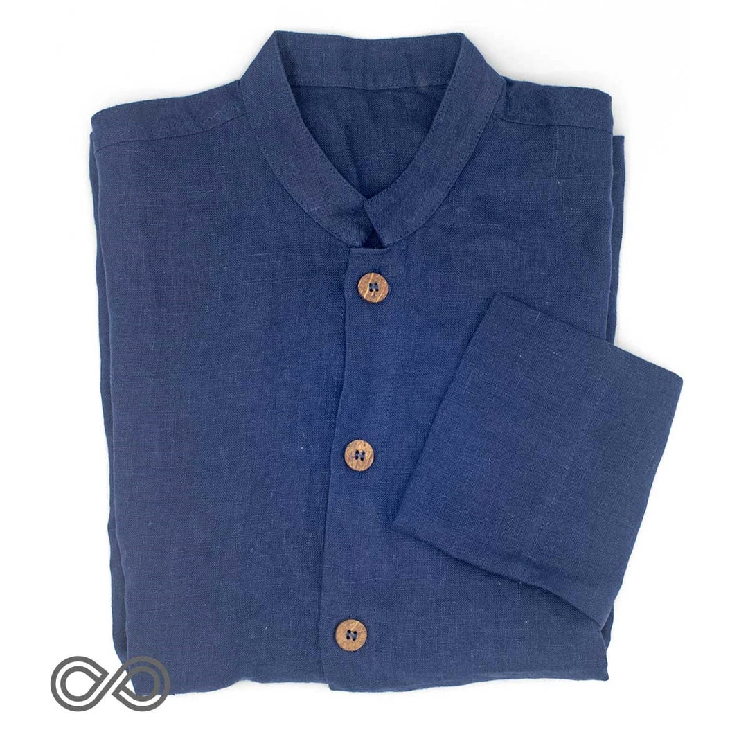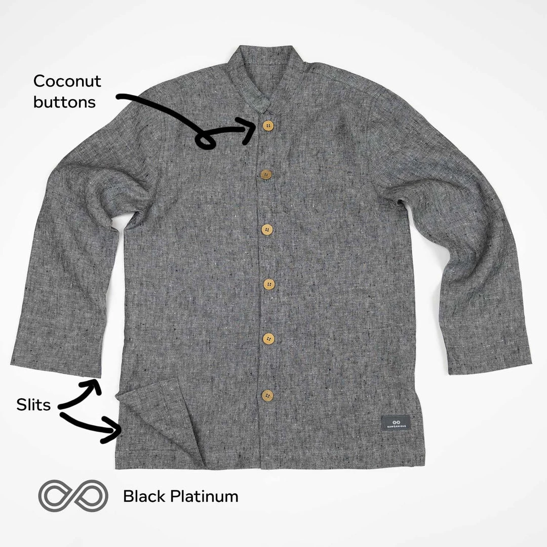 Banded Italian collar. Button down. Coconut buttons. Wear casual or dressy. Unisex. XS – XXL. Black, Black Platinum, Natural, Ivory, Indigo.
