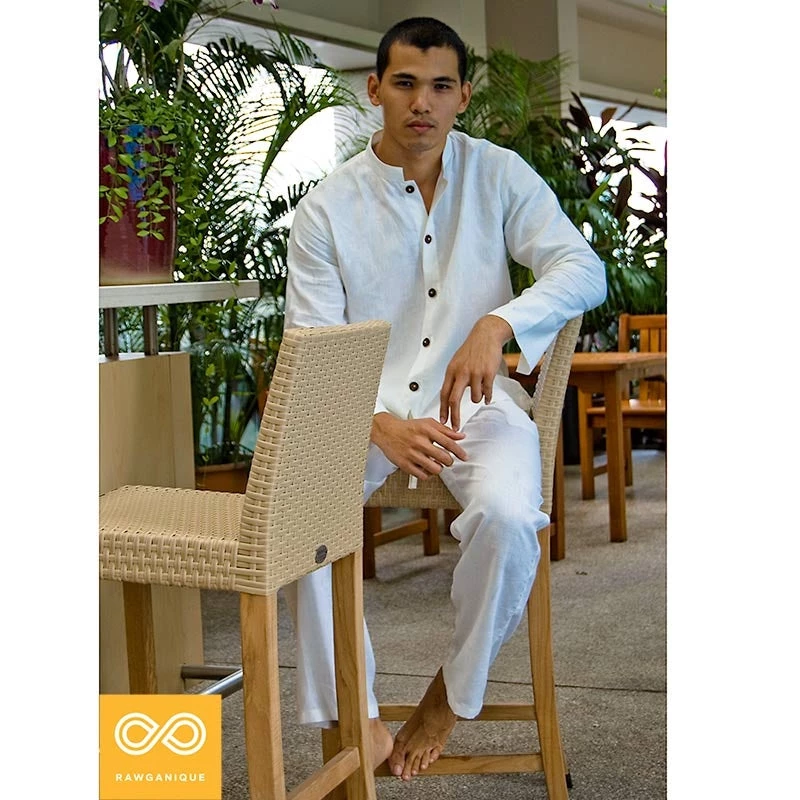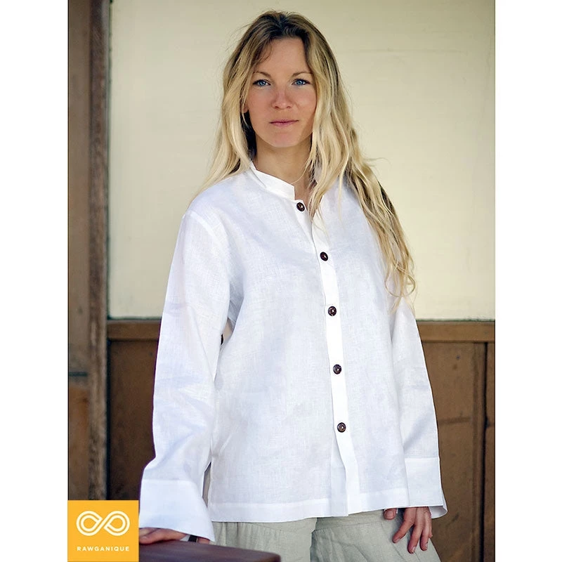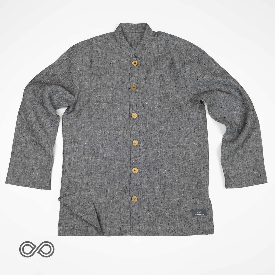 A simple elegant 100% hemp shirt fit for everyday wearing, meditation, and special occasions. Made from 5.75 oz 100% organically grown European hemp fabric that is soft, cozy, and breathable. Coconut buttons. Banded collar.