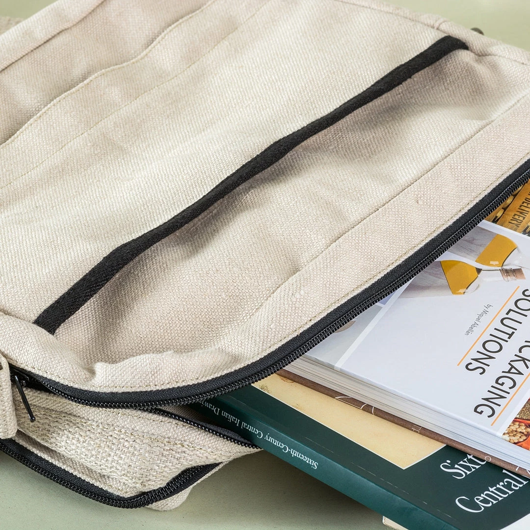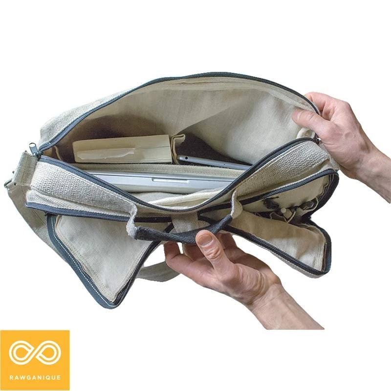 Premium sustainable & eco-friendly hemp laptop commuter bag from our curated collection of artisan handmade natural fiber bags. This Hemp Laptop Bag is simple, elegant & stylish. Also comfortably fits tablets in the two front compartments. Lots of pockets for cell phone, tablet, laptop computer, books, stationery & more. Zippered pocket in back for mounting on rolling carry-on handle. Roomy, handy, and pure, our Hemp Computer Bag does it all with eco-style. Easily fits 15″ MacBook Pro, plus any size tablet.