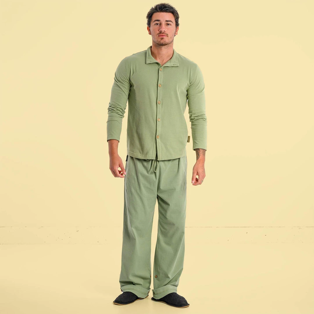 Cozy & pure 100% organic Prima cotton pajamas sleepwear loungewear set for sleep & at-home lounging. The tops are dressy enough for work and Zoom. Great for yoga and meditation, too. Elastic-free. Plastic-free natural carved 100% tagua nut or coconut buttons. Scroll down for sizing.