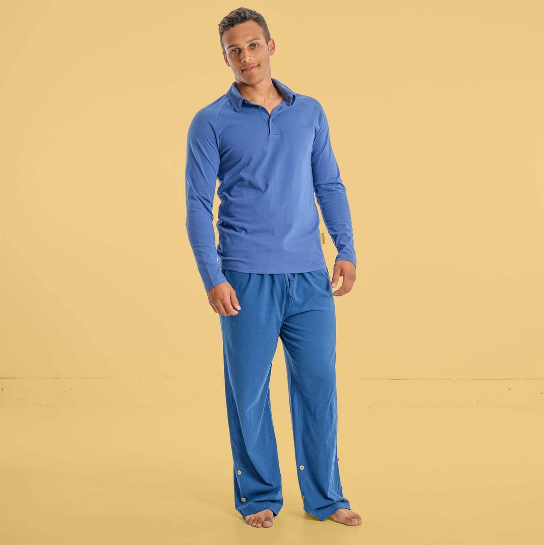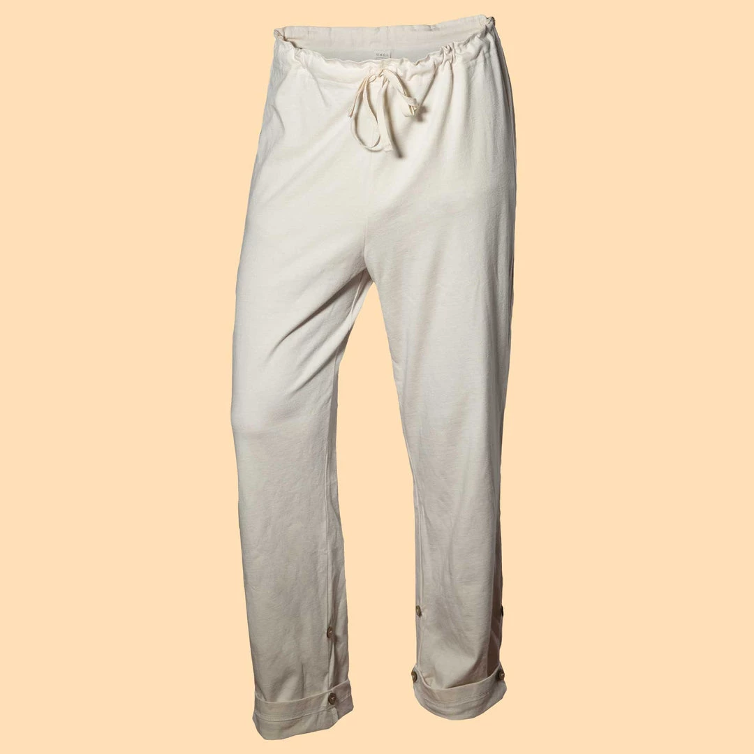 - 1 pajama bottom (Interlaken Organic Cotton Jammy Bottom). The bottom is available as default elastic-free, with adjustable length thanks to the ingeniously designed button system), with organic cotton drawstring. The pants are also made in a version with elastic; if you want this version, please order the top and bottom separately, and choose ‘With Elastic’ on the Interlaken Organic Cotton Jammy Bottom page.