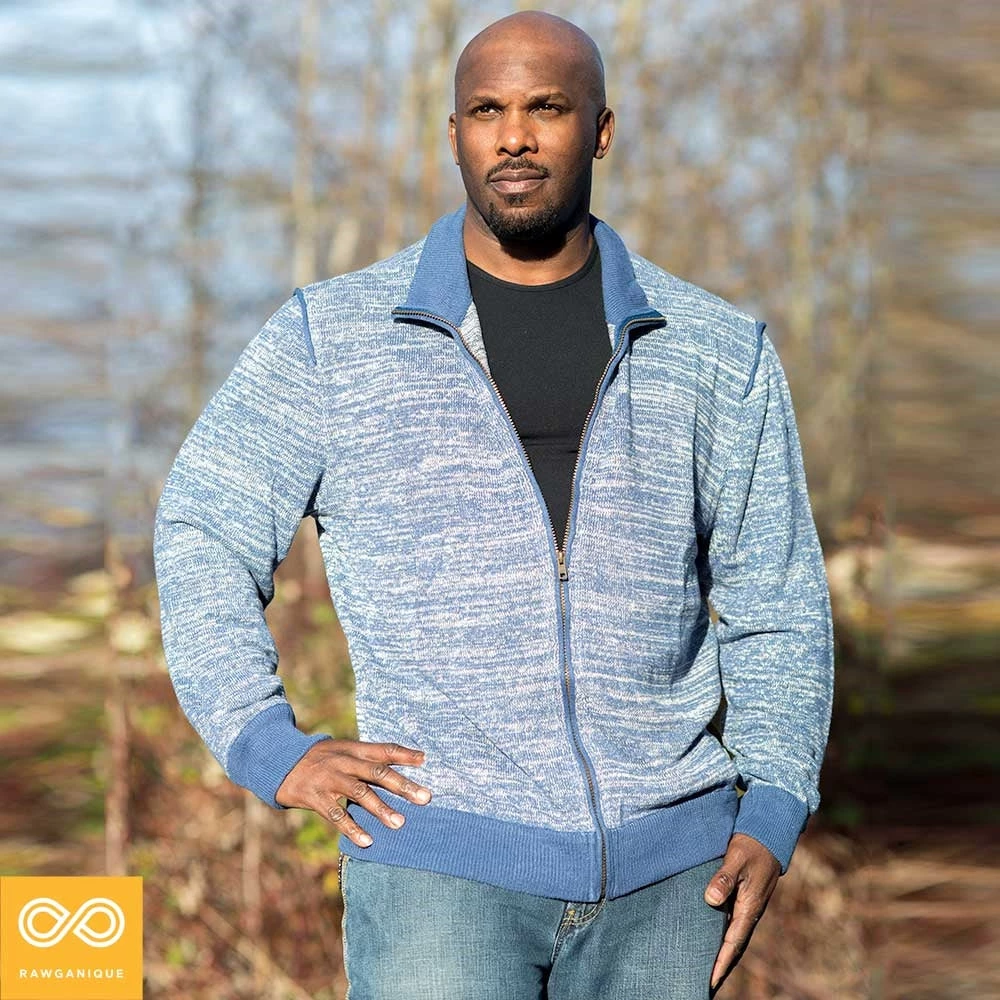 The Union Square Hemp Zip-up Swaeter is made from our famous 100% hemp rainbow knit that is soft and cozy: from variegated hemp yarns in different shades of blue and white.