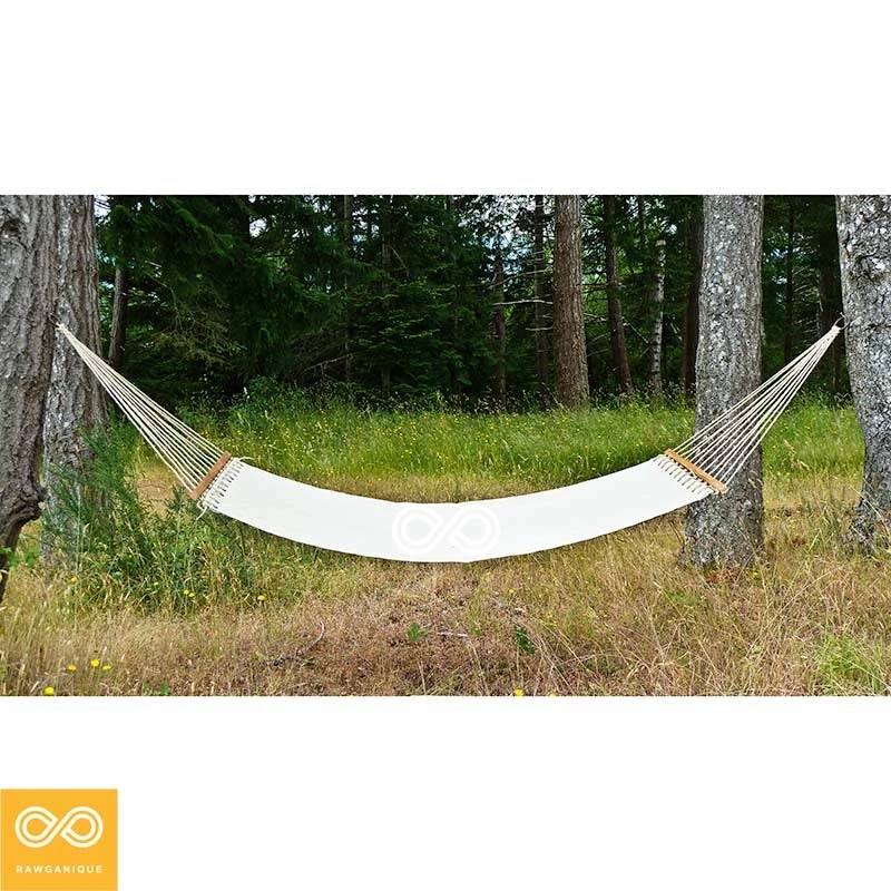 Our two-person 100% hemp hammock features untreated natural wooden spread bar.