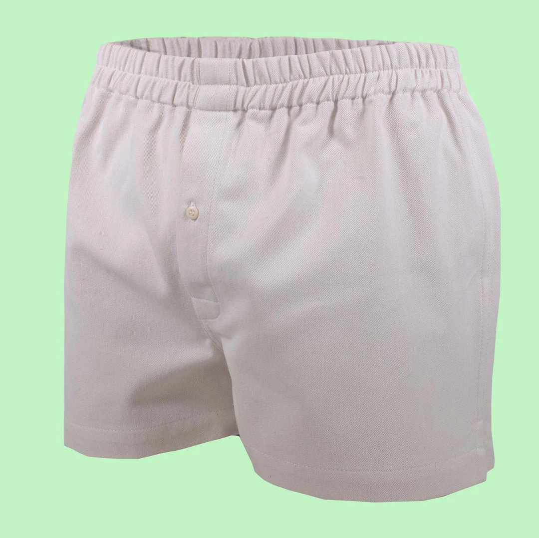 These 100% Organic Cotton Twill Boxers are chemical-free, hypoallergenic, sustainable & super comfy. Great as 100% organic house shorts & pajama shorts, too. Tagua-nut button in front. Same cut as our popular Buxton Elastic-Free Organic Cotton Twill Boxers.