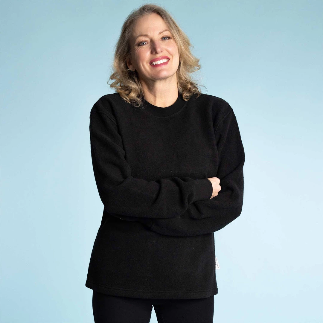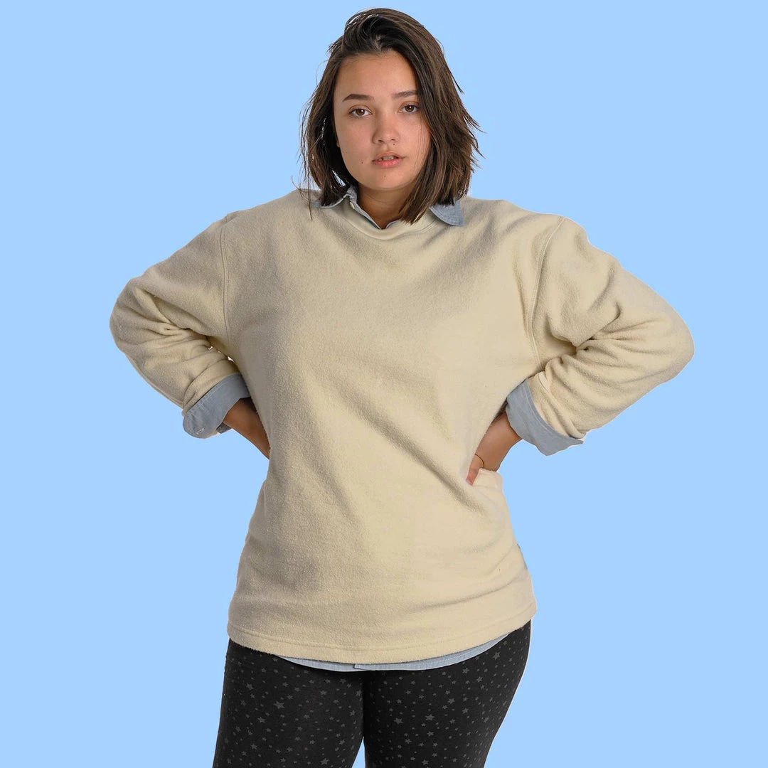 In high demand. Customers stock up on these as soon as we finish a new production. We are constantly making more of these super special organic cotton sweatshirts. Thank you for your patience. World’s first and only 100% organic cotton fleee that’s brushed on both sides for ultra softness and warmth. Super plush! Plastic-free. Sizing chart in Image Gallery.